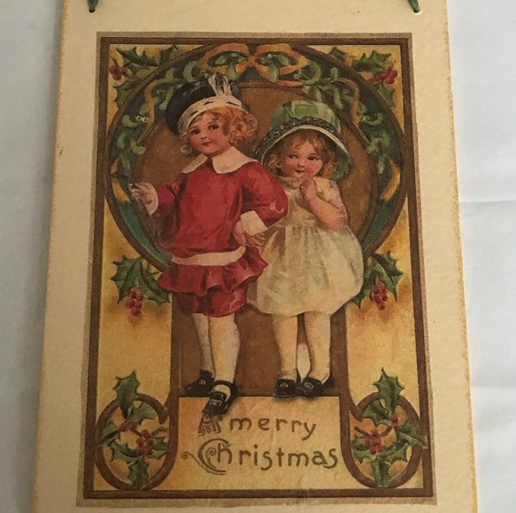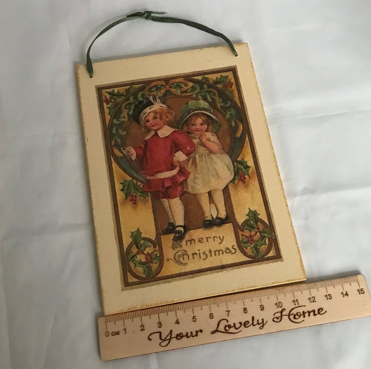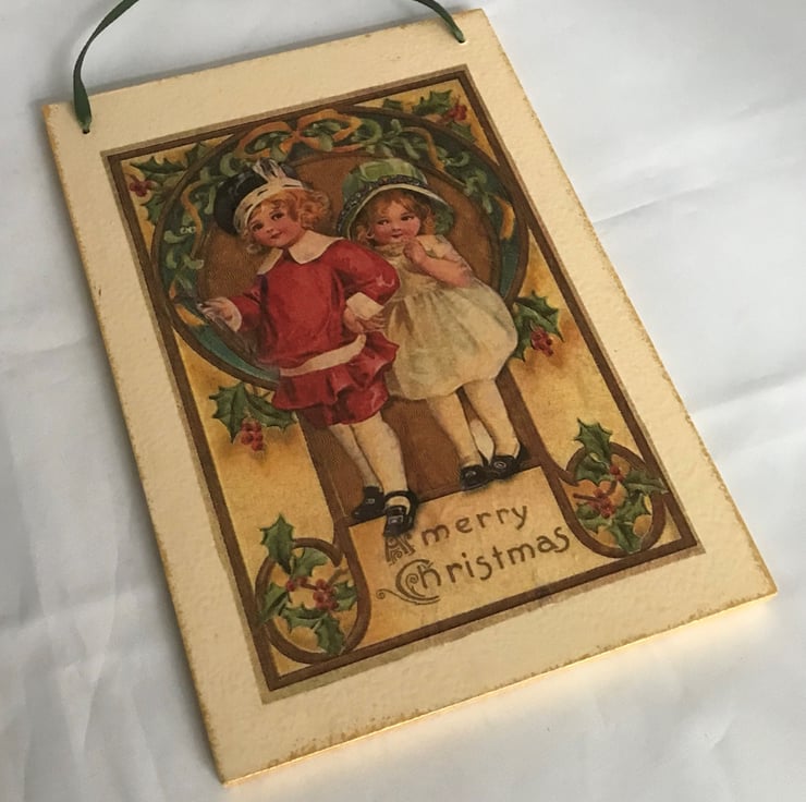 Vintage Children Merry Christmas Wooden Plaque Decoration