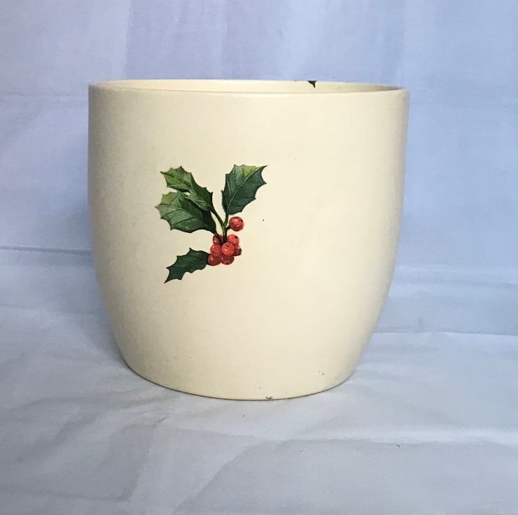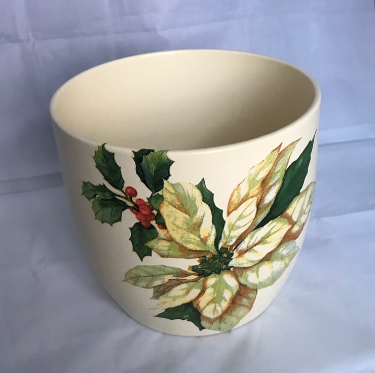 This is a round, cream, ceramic plant pot decorated with a beautiful paper napkin image of a white Poinsettia on one side and a small Holly sprig on the reverse.