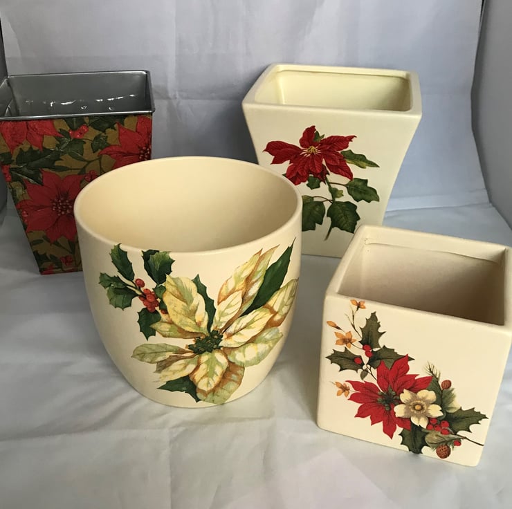 This is a round, cream, ceramic plant pot decorated with a beautiful paper napkin image of a white Poinsettia on one side and a small Holly sprig on the reverse.