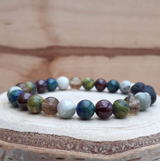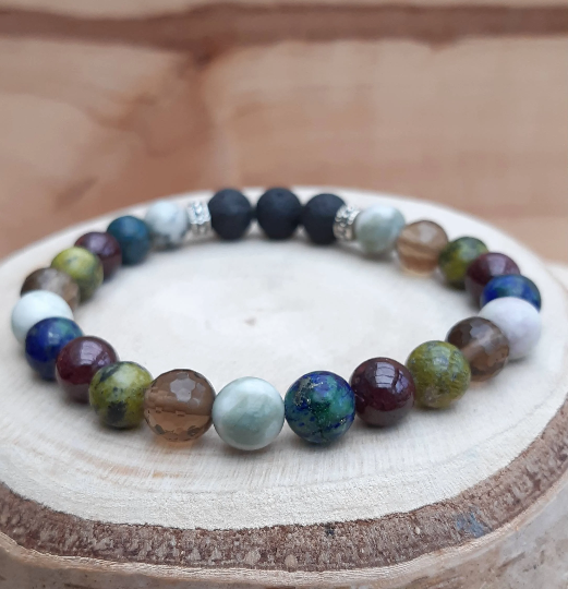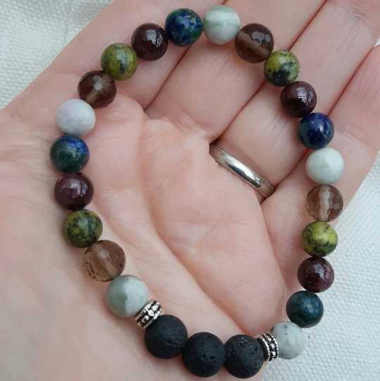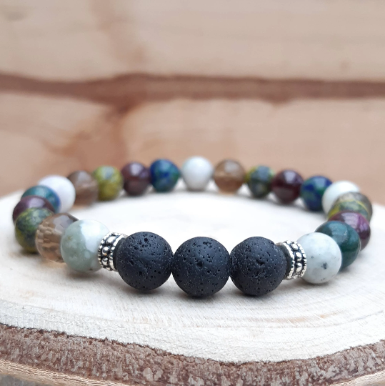 This diffuser bracelet was created with a selection of peaceful and loving crystals for this Christmas season. It is made with a selection of 8mm beads - peace jade, smoky quartz, chrysoprase, garnet and chrysocolla - together with 8mm black lavastone beads and Tibetan silver spacers (lead- and nickel-free).