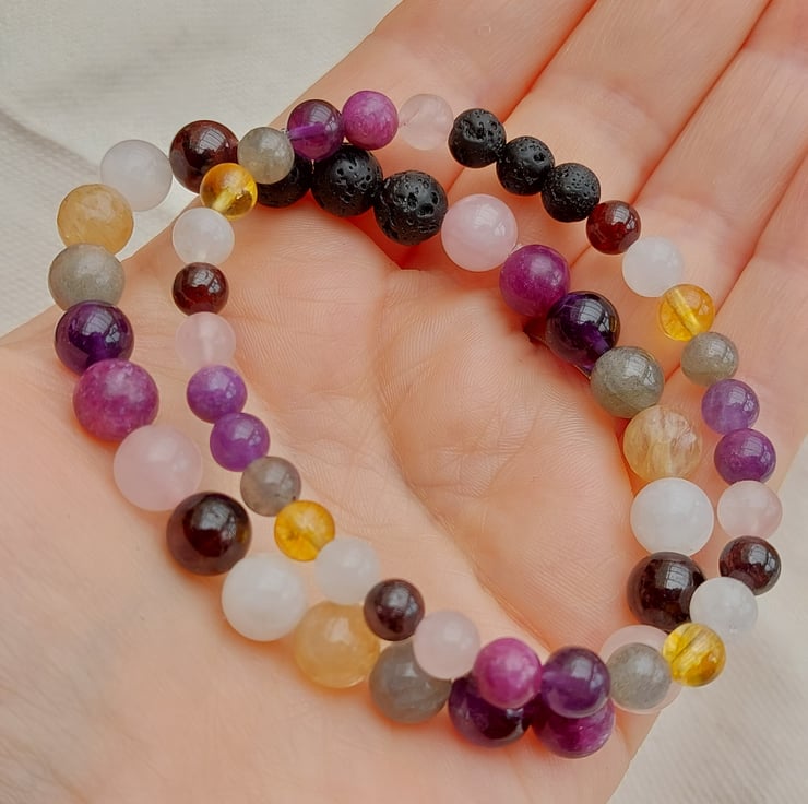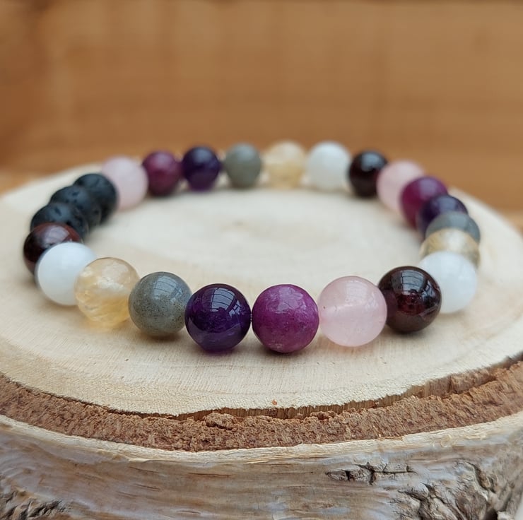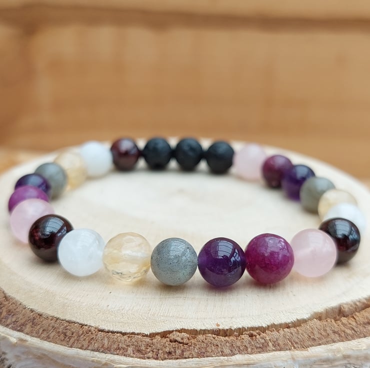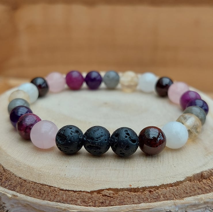 A bracelet designed to offer menopause support. Made with rose quartz, lepidolite, amethyst, labradorite, citrine, moonstone, garnet and lavastone beads.