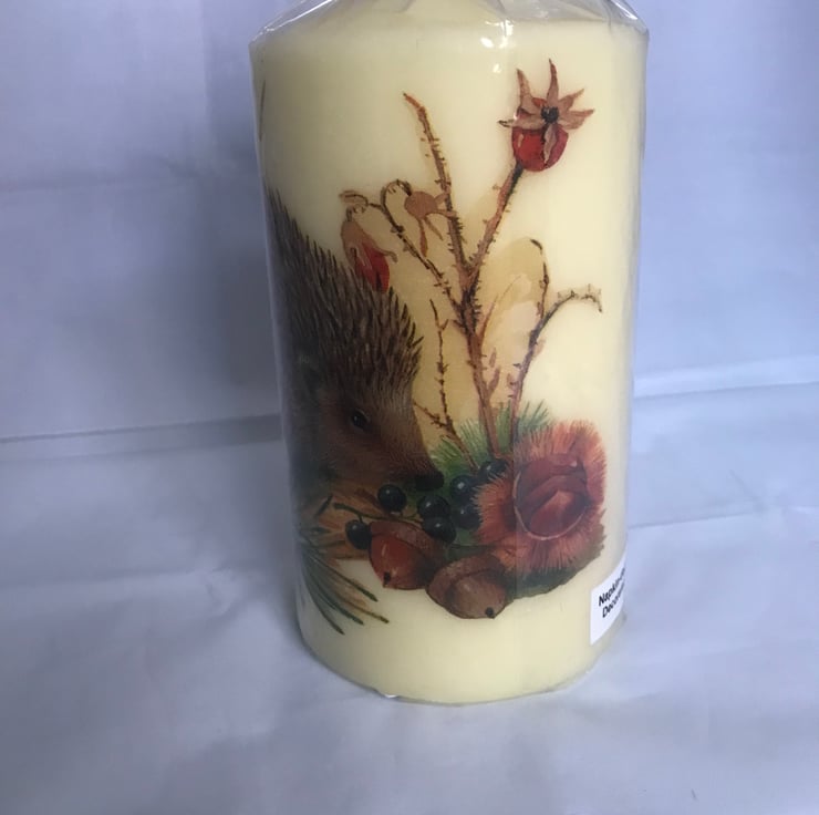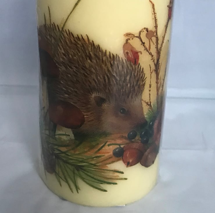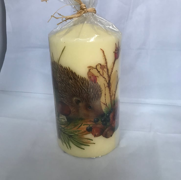 The image has been part ‘wrapped’ around the candle, and a small image of nuts, leaves and berries has been applied into the space between the two edges of the hedgehog image, so that there is something to see from all angles, e.g., if this candle is a centrepiece on the table.