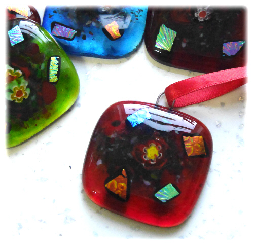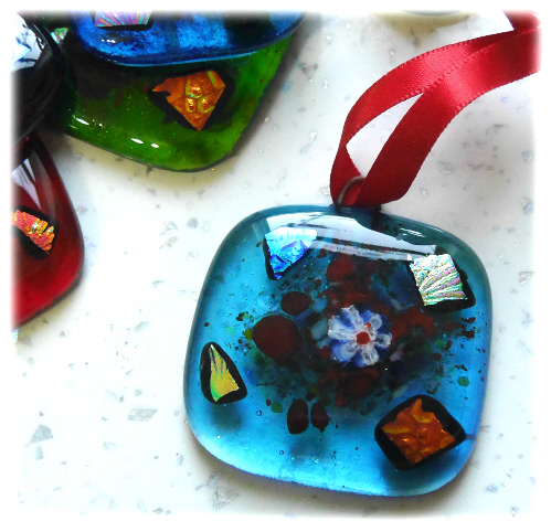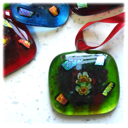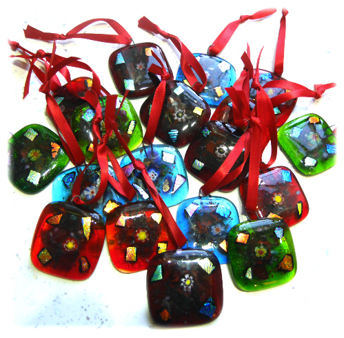 They are all decorated with a little central flower, some colourful frit and dichroic glass accents to make them sparkle in the lights of the tree..