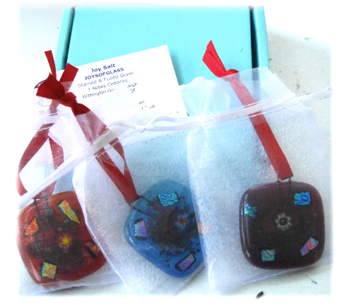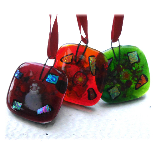 Sets of 3 fused glass decorations, jewels.