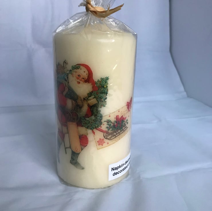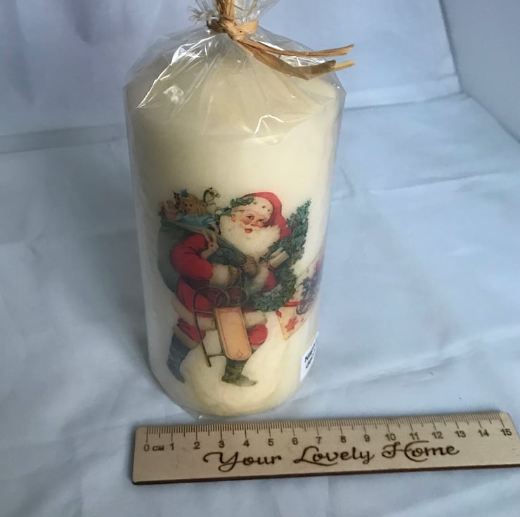 I have decorated this unscented cream candle with a lovely crisp image of a happy, smiling Santa with his overflowing sack and other gifts.