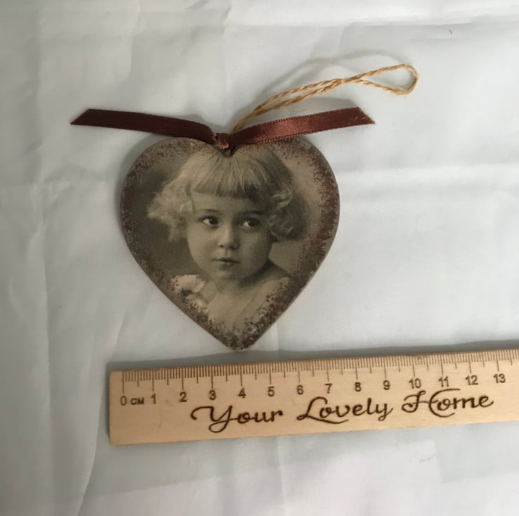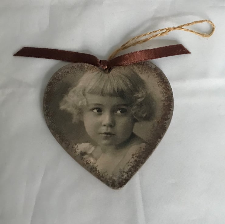 The image is in a sepia tone and looks aged, whilst the reverse side of the heart is plain, painted in a brown or brown-white sponged mix colour. The heart has a brown ribbon to complete the vintage look of the piece.