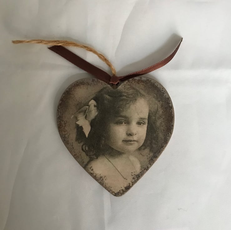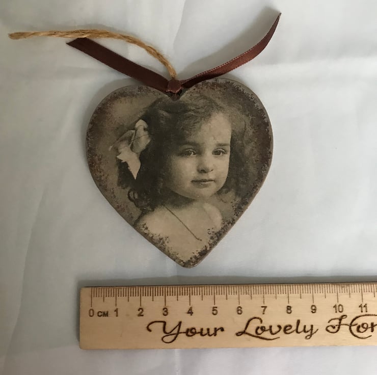 The image is in a sepia tone and looks aged, whilst the reverse side of the heart is plain, painted in a brown or brown-white sponged mix colour. The heart has a brown ribbon to complete the vintage look of the piece.