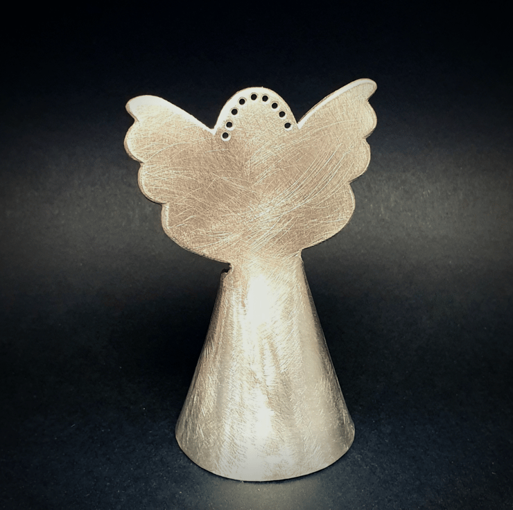 A beautiful Angel hand pierced from pewter sheet, and formed into a free standing ornament.