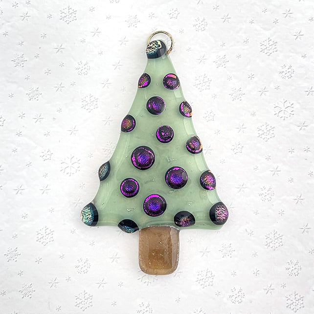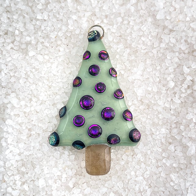 Created from layered Bullseye glass in my Whitstable workshop. This spotty tree has a gorgeous sparkly pink colour scheme with an iridescent brown trunk and a sparkly top.