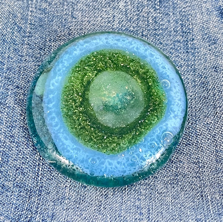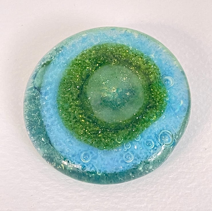 Created from layered Bullseye glass in my Whitstable workshop. Plated sterling silver brooch back glued with epoxy resin to create a permanent bond. Supplied in a gift box.
