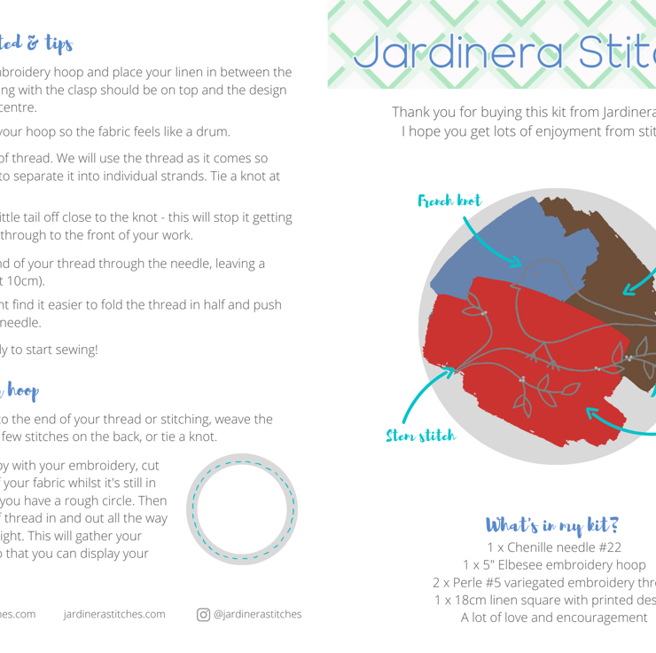All of my kits come with full printed instructions and guides to starting and finishing your embroidery.