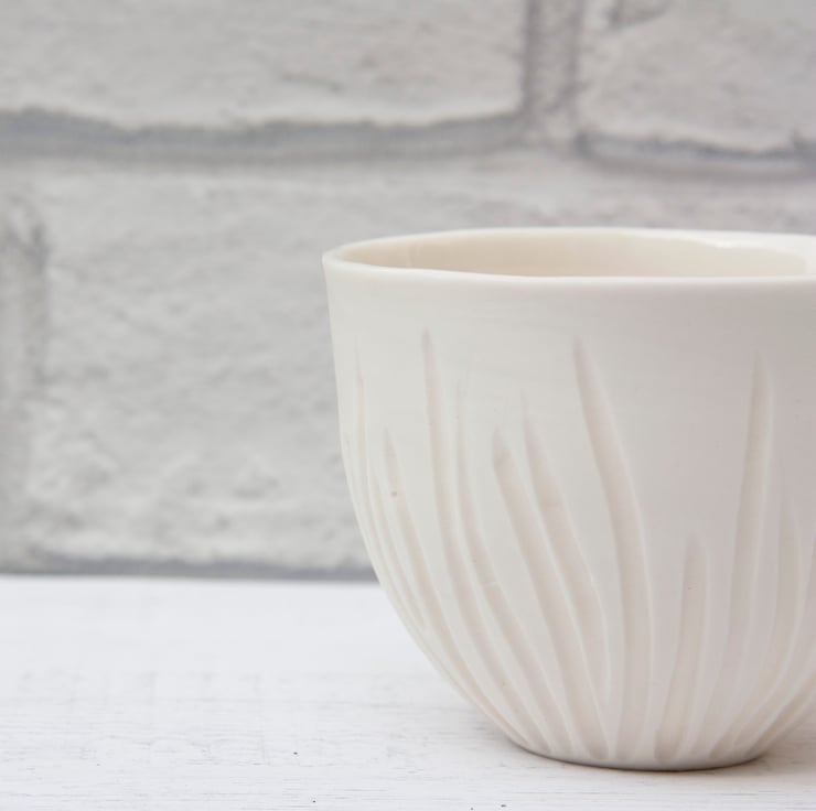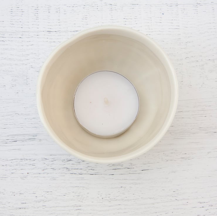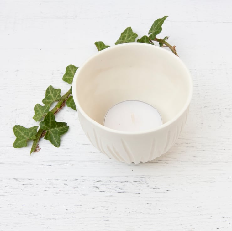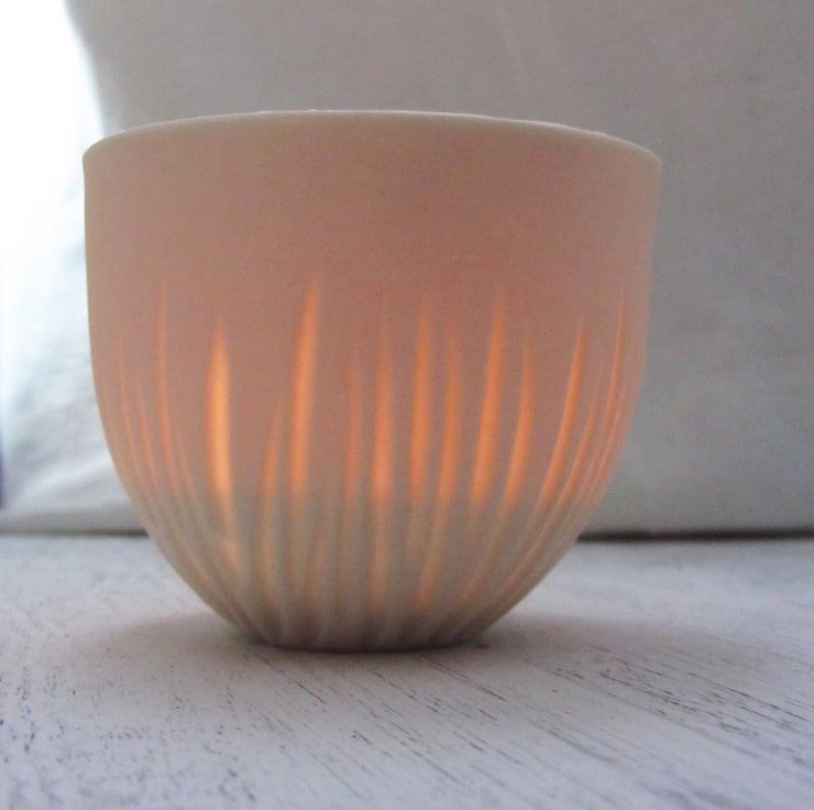 Porcelain tea light holder, with a grass like pattern. The votive is glazed on the inside to make wiping wax out easier. The outside is unglazed so it has a satin feel.