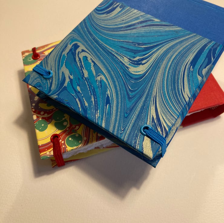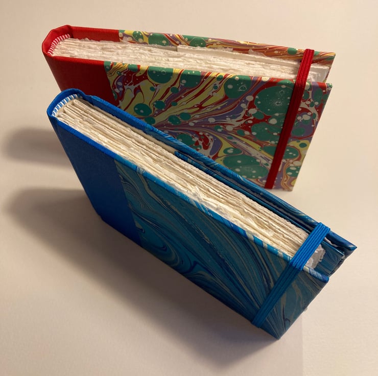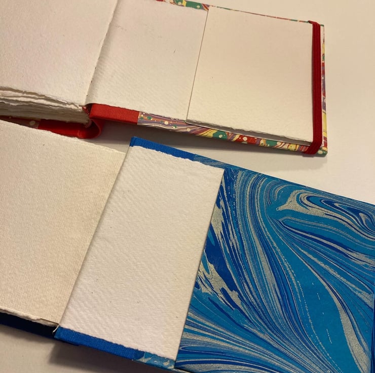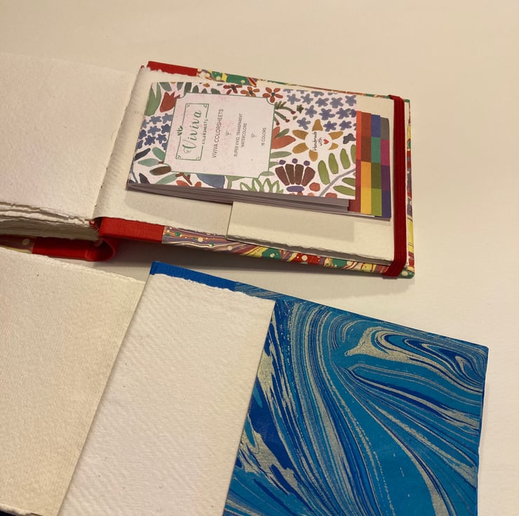 Handmade A6 Sketchbook containing 38 leaves (76pp) watercolour paper. Rounded spine covered with blue bookcloth and hand marbled paper from Jemma Lewis Marbling. Finished with blue and white endbands, a back page pocket and a blue elastic closure. Viviva Coloursheets not included.