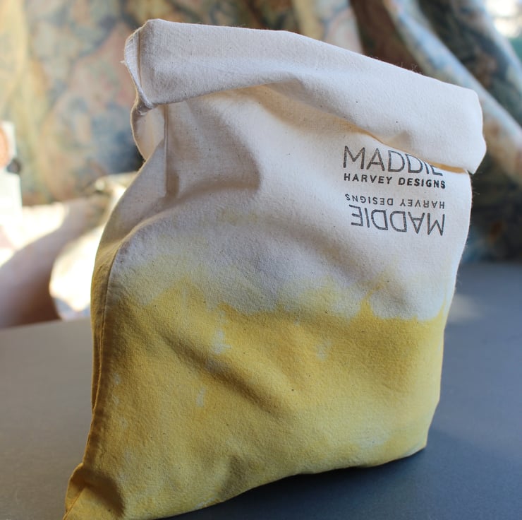 A beautiful medium-sized project bag, dipped-dyed by hand and hand-stamped by Maddie.