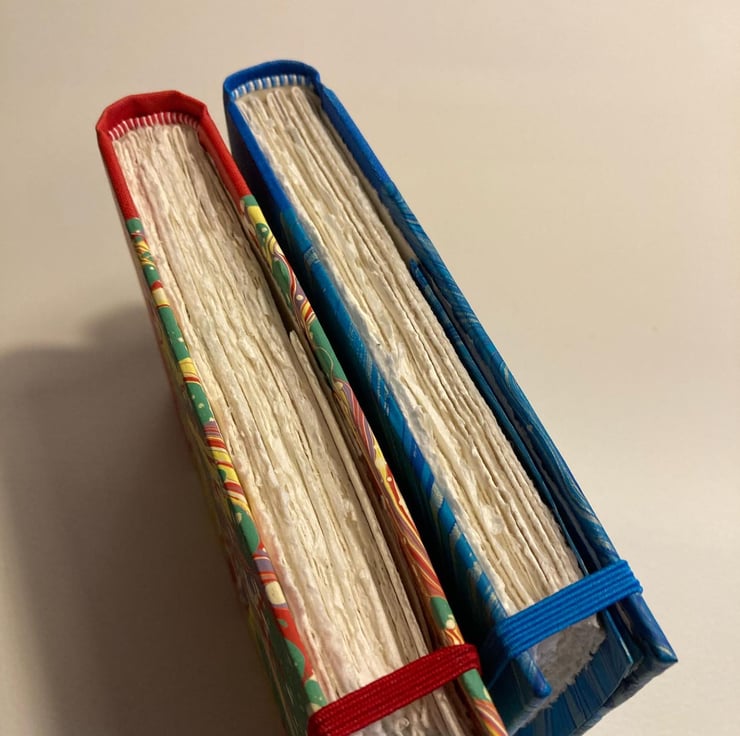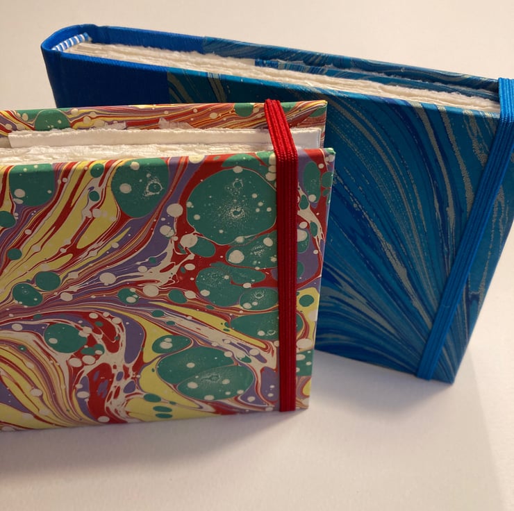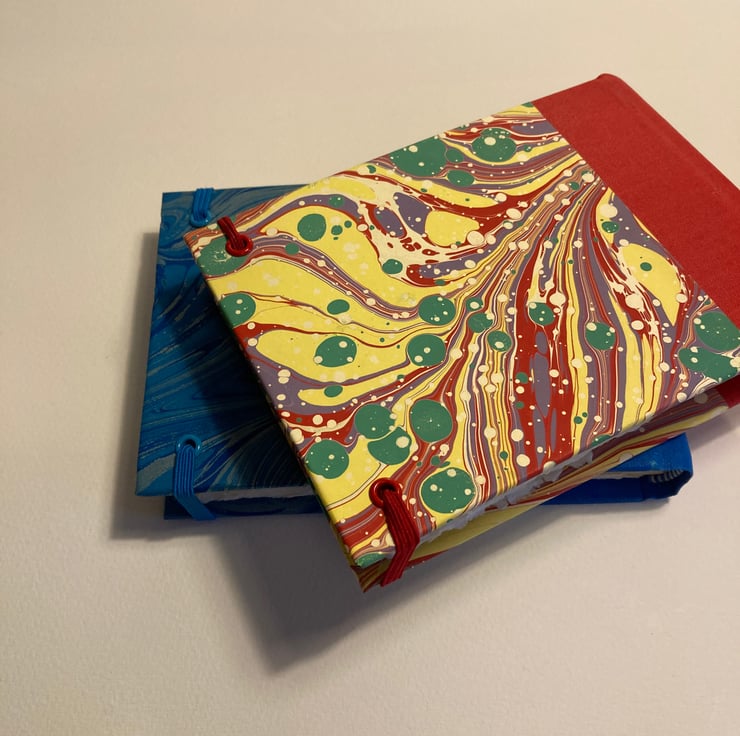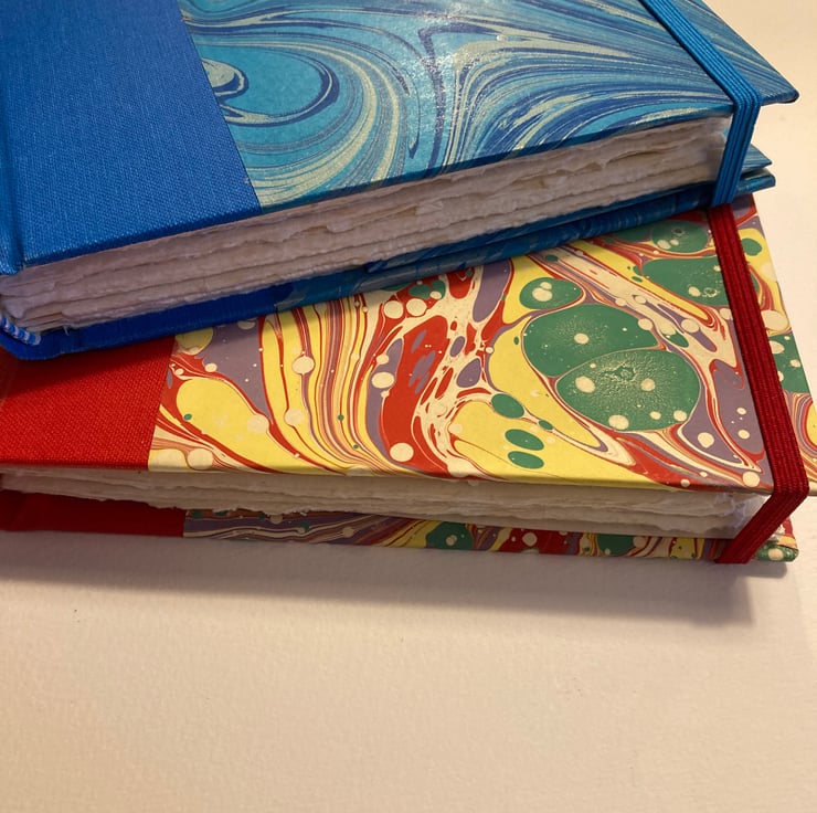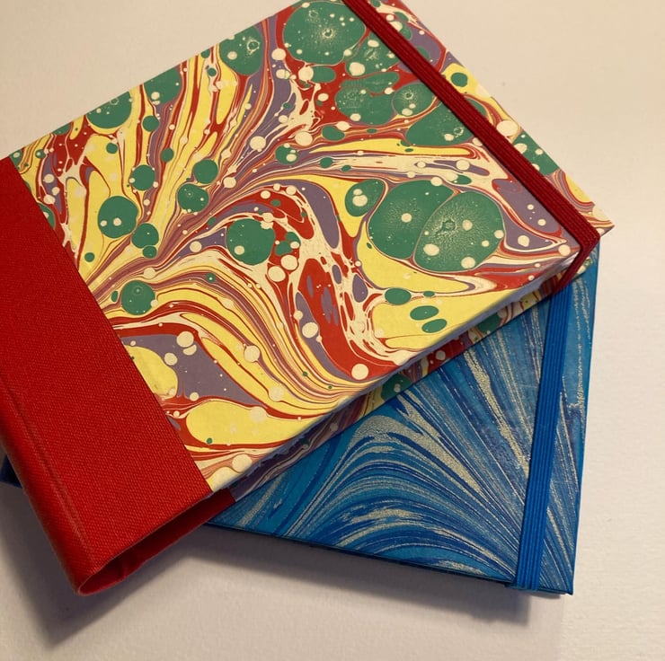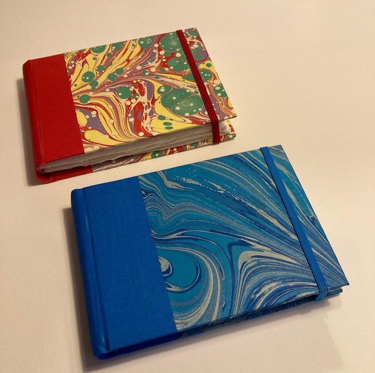 Handmade A6 Sketchbook containing 38 leaves (76pp) watercolour paper. Rounded spine covered with red bookcloth and hand marbled paper from Jemma Lewis Marbling. Finished with red and white endbands, a back page pocket and a red elastic closure. Viviva Coloursheets not included.