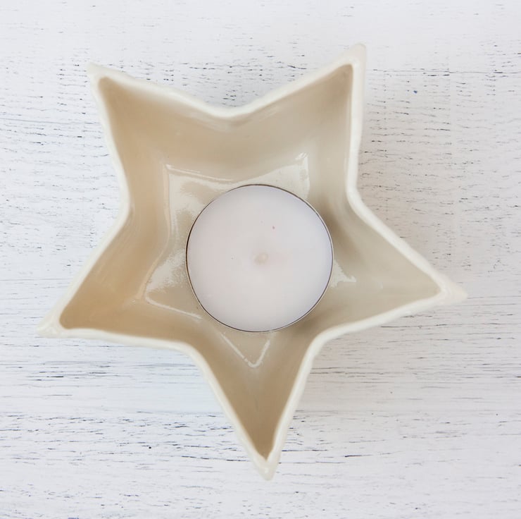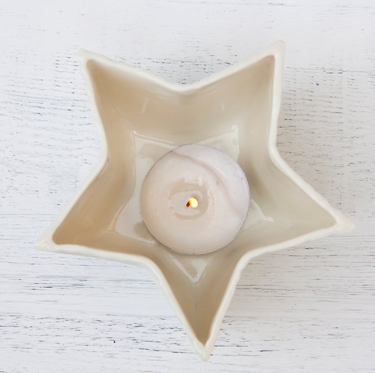 This is a larger version of my star tealight holder. It is 10.5cms at the widest points and 6cms high. Its glazed inside and out with a clear glaze.
