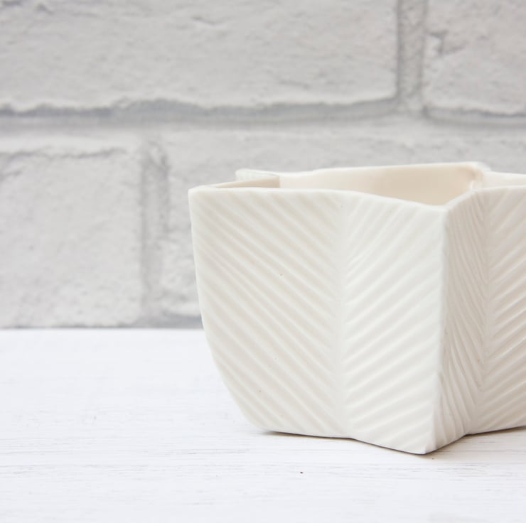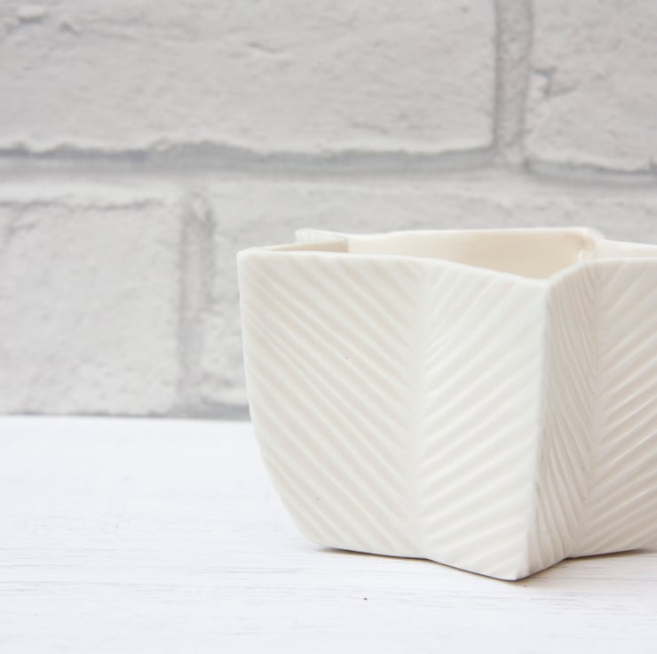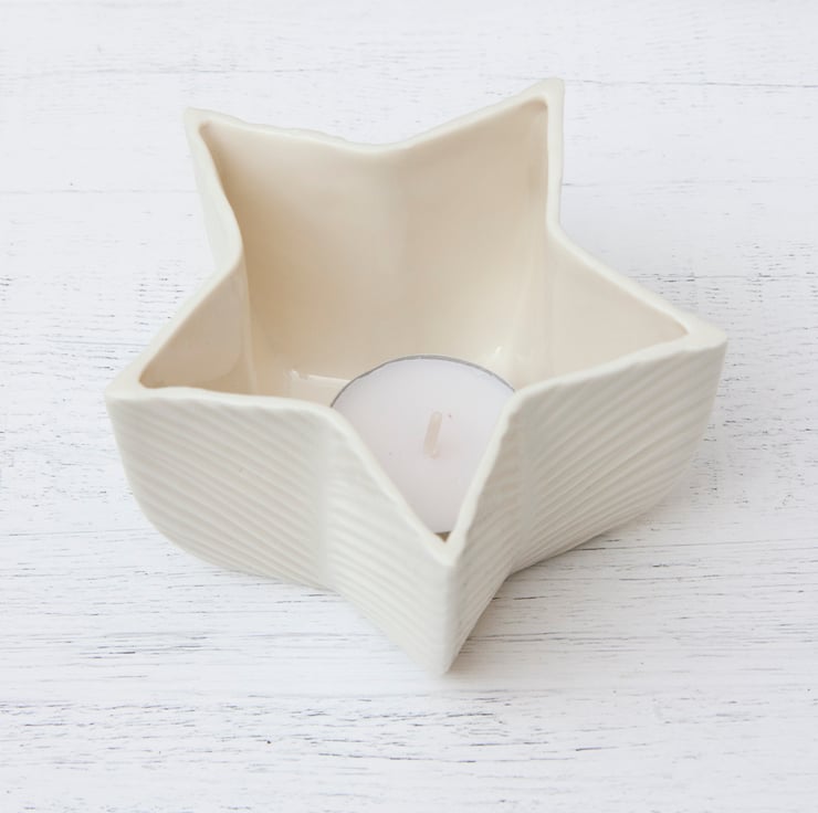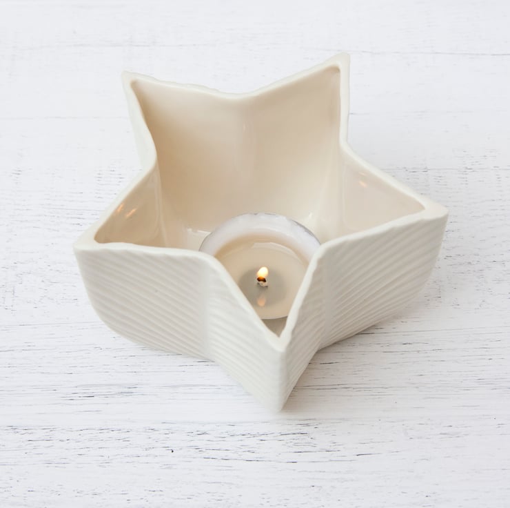 Star tealight holder made to order from porcelain. Each piece is carved to give a pleasing texture which, when lit, allows light to filter through the translucent porcelain.