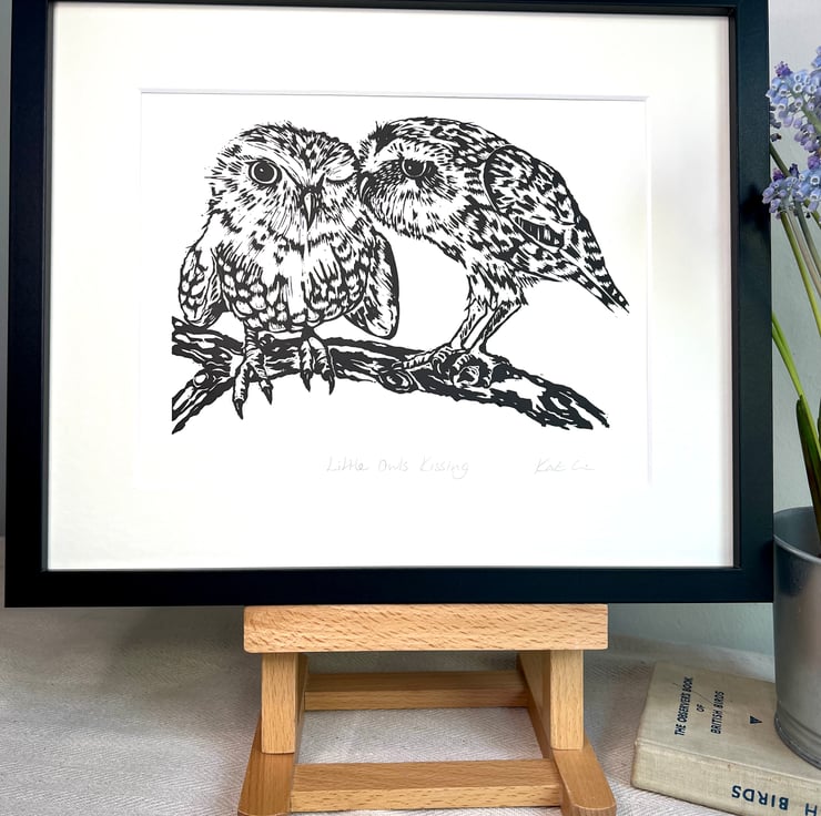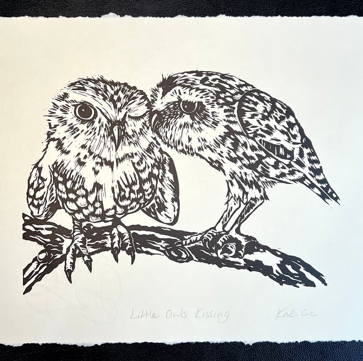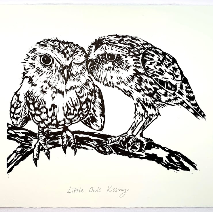 Little Owls Kissing is a handprinted Lino Print. The image has been carved from Japanese Vinyl then printed using water based oil inks.