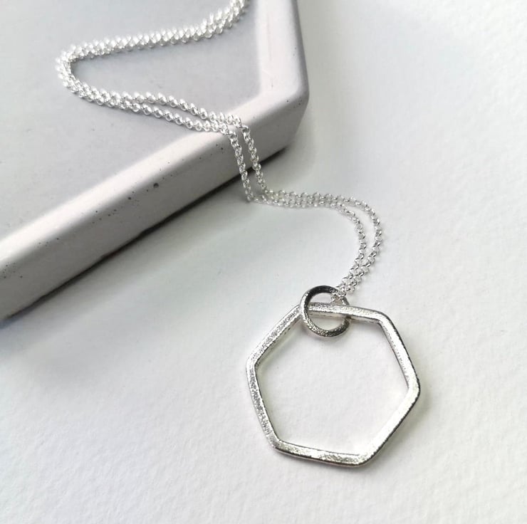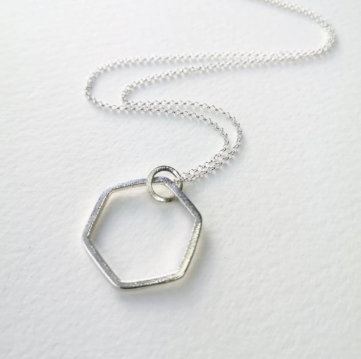This lovely geometric hexagon necklace measures approximately 2cm across and is formed from sterling silver square wire and has been frosted for an eye-catching finish. The hexagon pendant hangs on an 18" belcher chain.