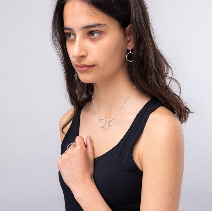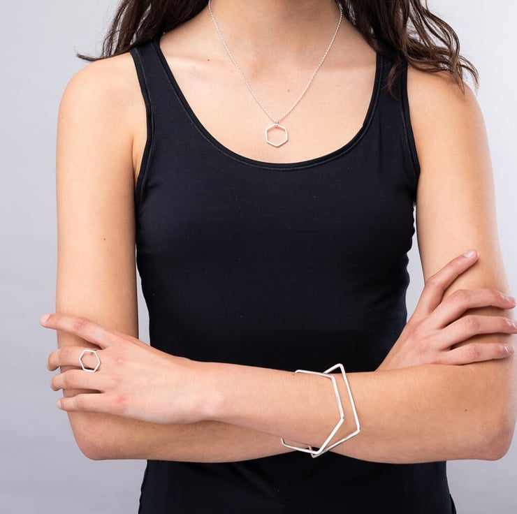 I love the simple beauty of the hexagon and have been inspired to make many hexagonal pieces that complement one another, including studs, threader earrings, necklaces and bangles, all available in my shop.