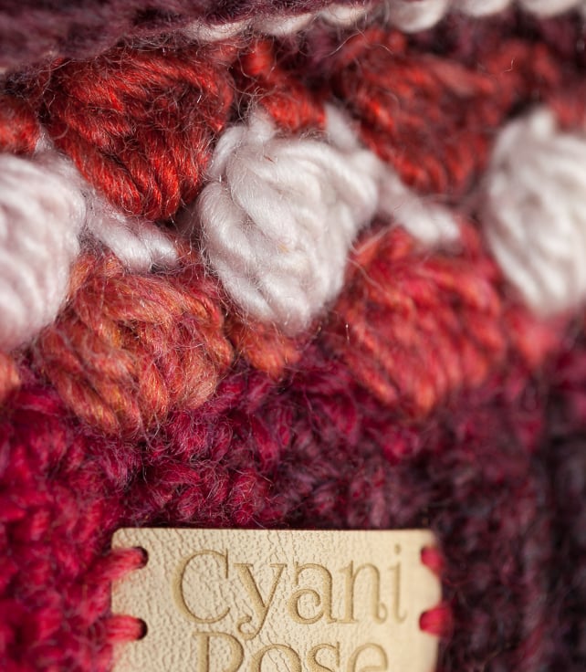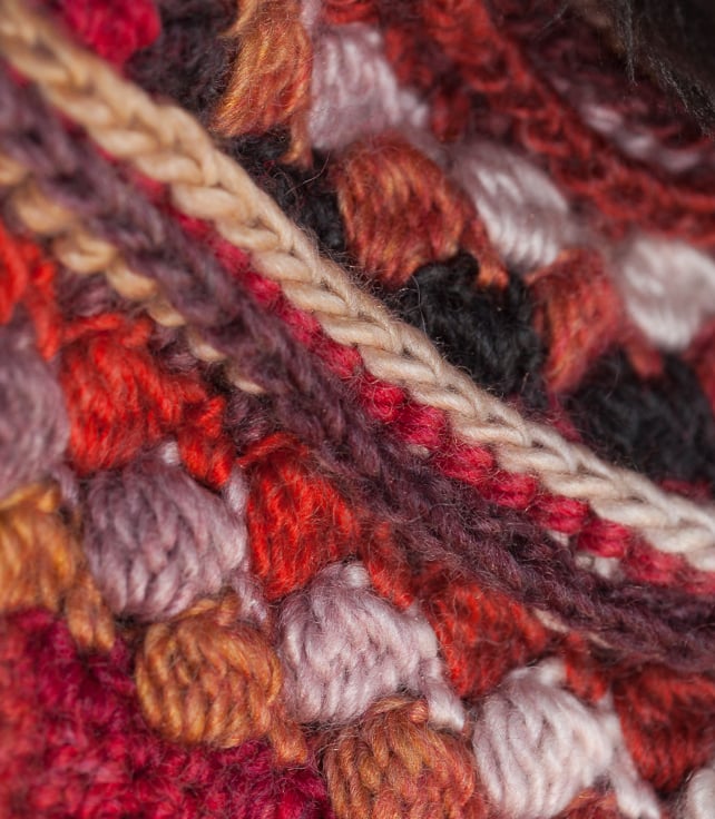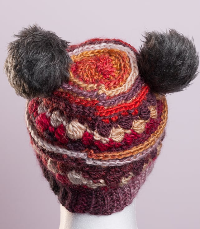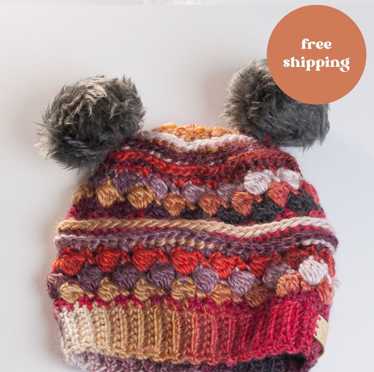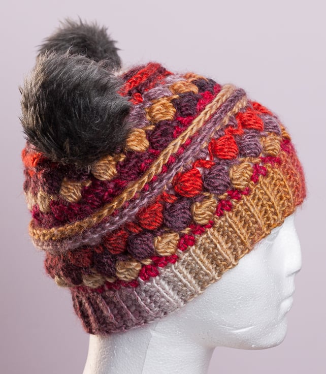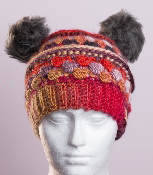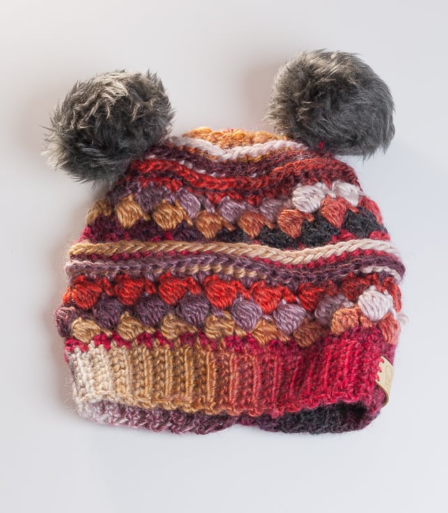 It is a lovely multi colour with a two handmade faux fur pompoms.