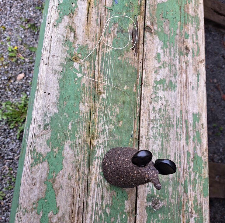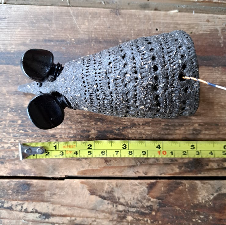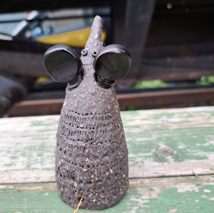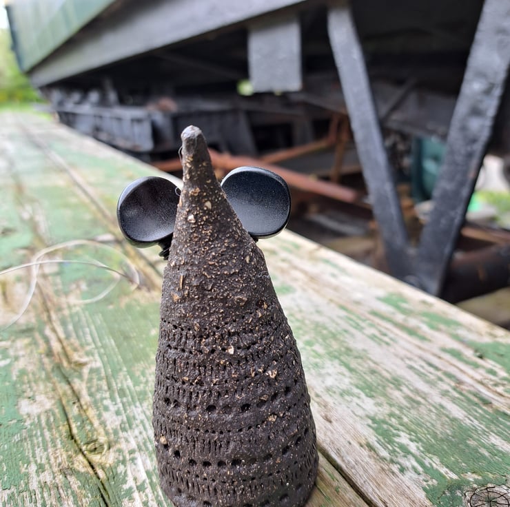 Handbuillt mouse, created here at the Station Cat Pottery, each mouse has upcycled fiddle pegs for ears and a repurposed fiddle string as a tail.