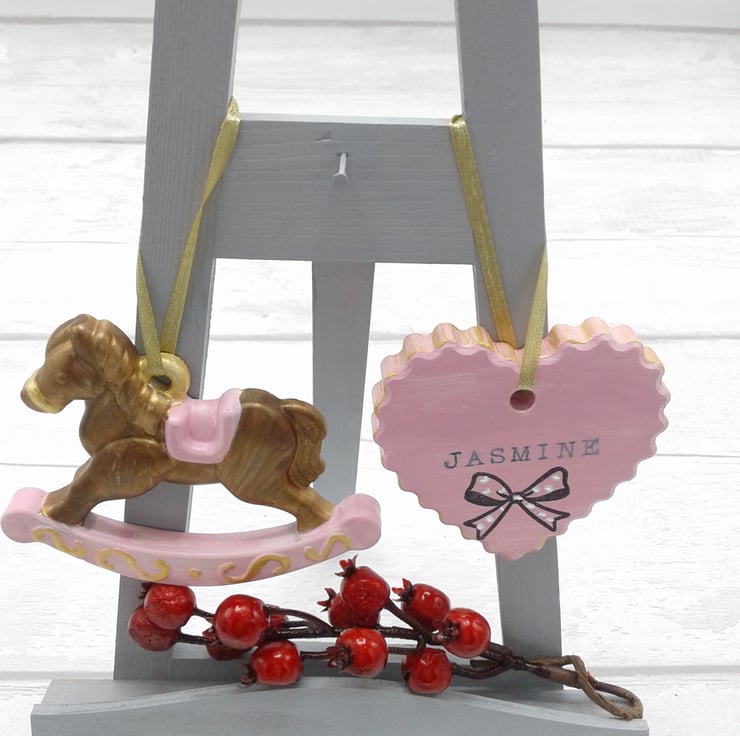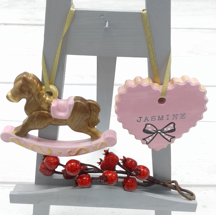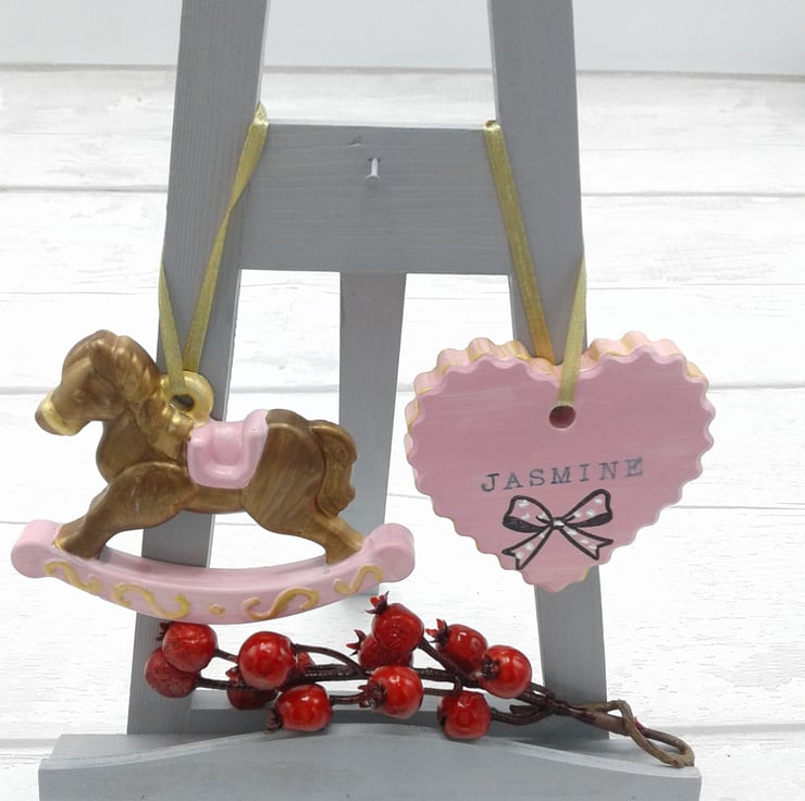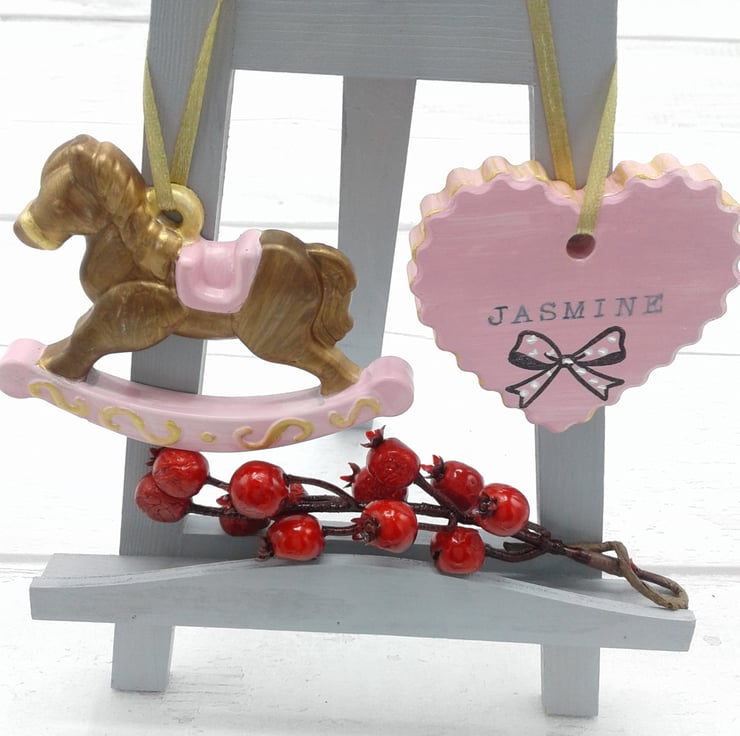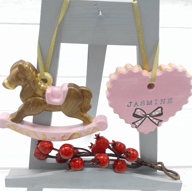 This is a set of 2 ceramic decorations. A lovely set for baby's first christmas. Personalised. Presented in gift box.