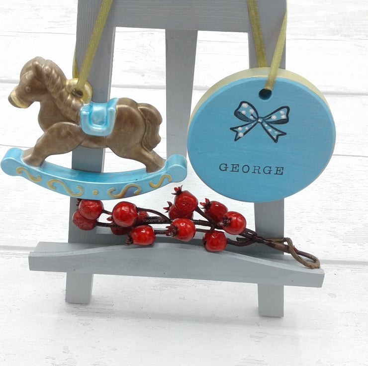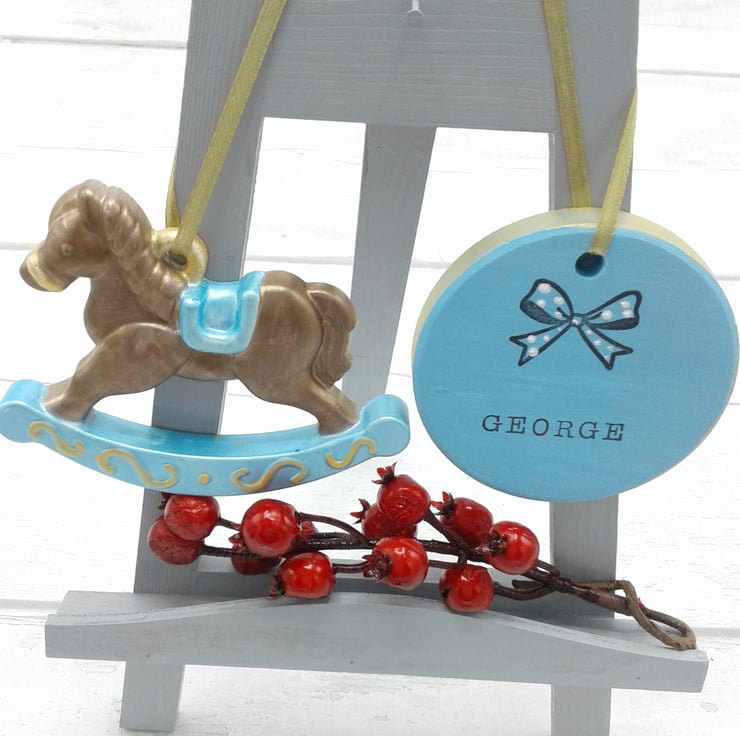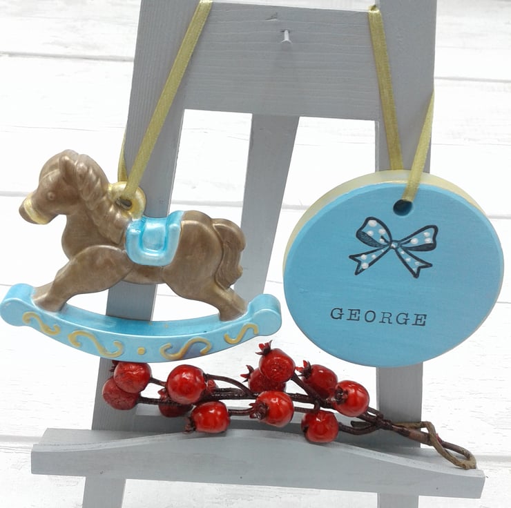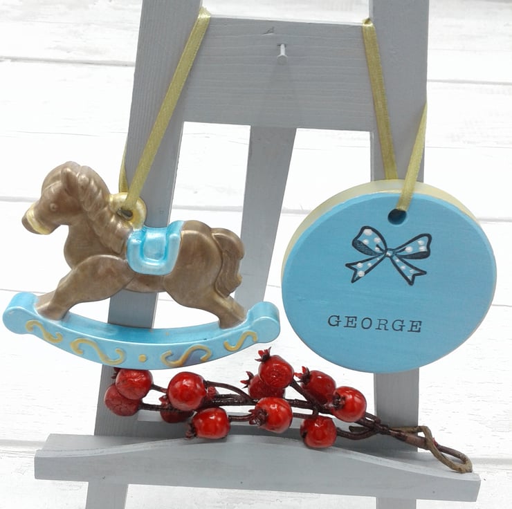 This is a set of 2 personalised ceramic decorations. Comprising of ceramic rocking horse and personalised ceramic circle.