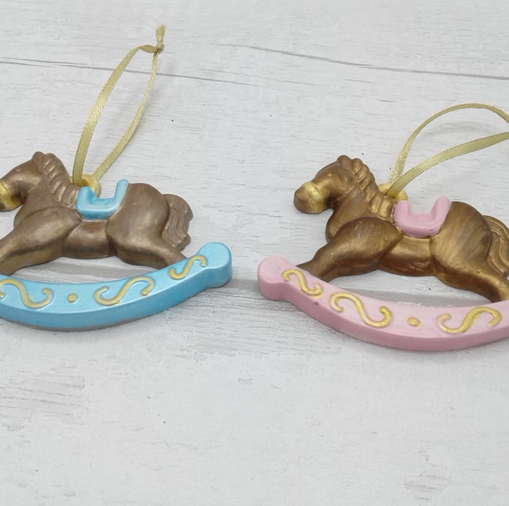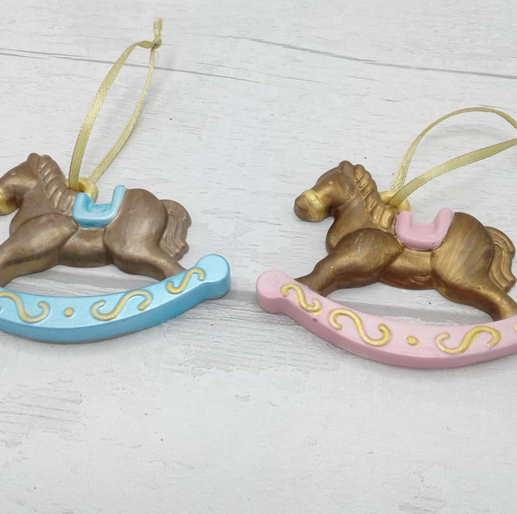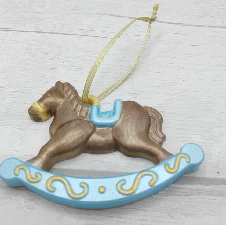 This is a ceramic rocking horse Christmas tree decoration which is the perfect keepsake for baby's first Christmas.