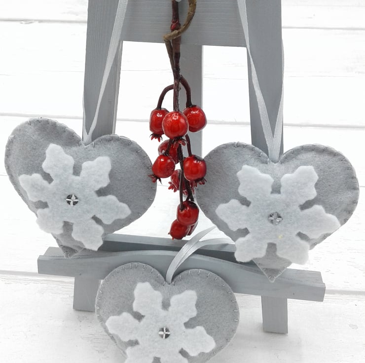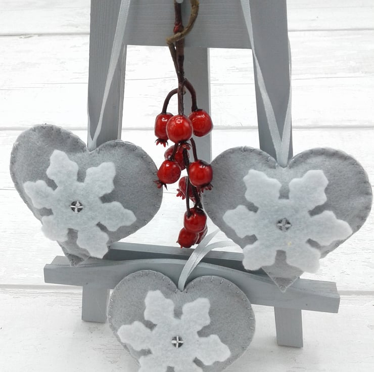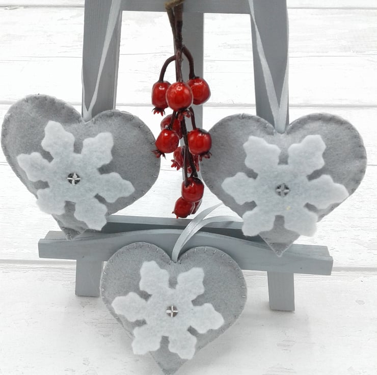 This is a set of 3 grey felt hearts with snowflake decoration.