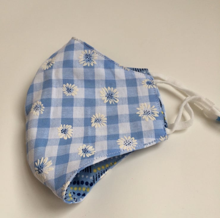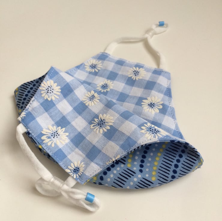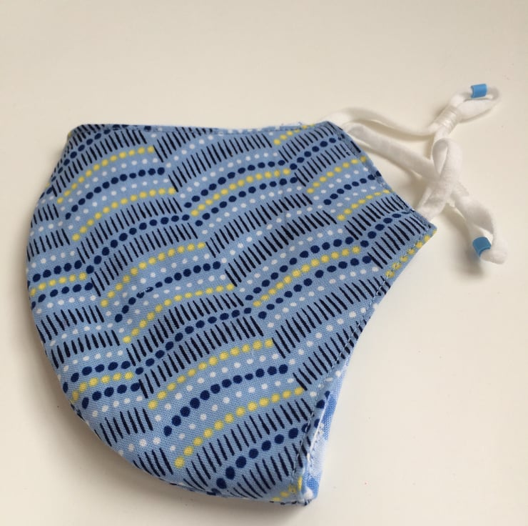 This mask is made from a blue and yellow spotty fabric and lined with pale blue gingham.