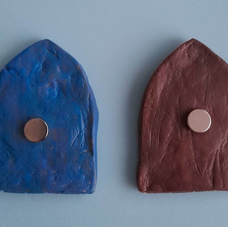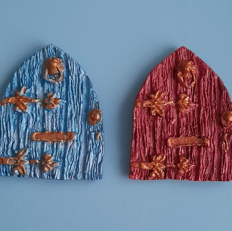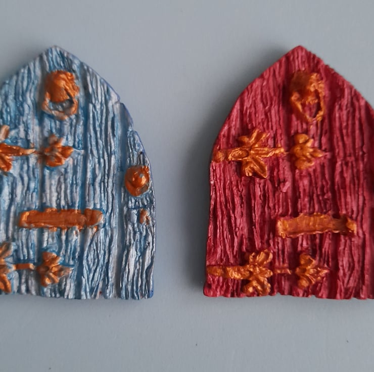 Fairy door magnet set of 2, made from clay and decorated with acrylic paint.
