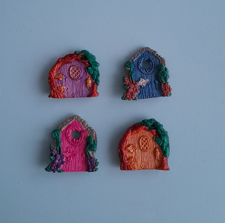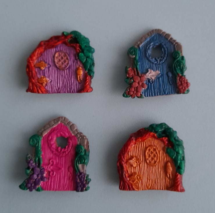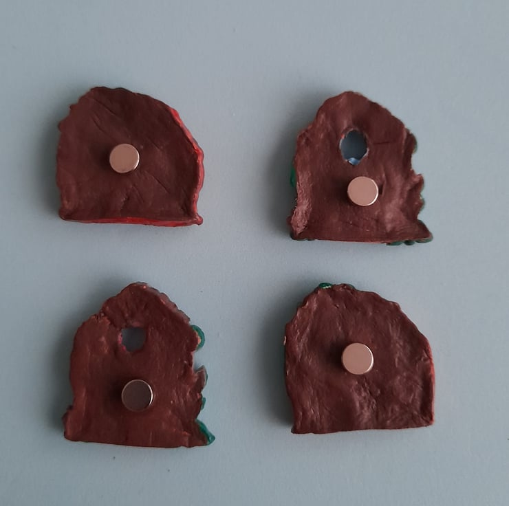 Mini Fairy door magnets set of 4, made from clay and decorated with acrylic paint.