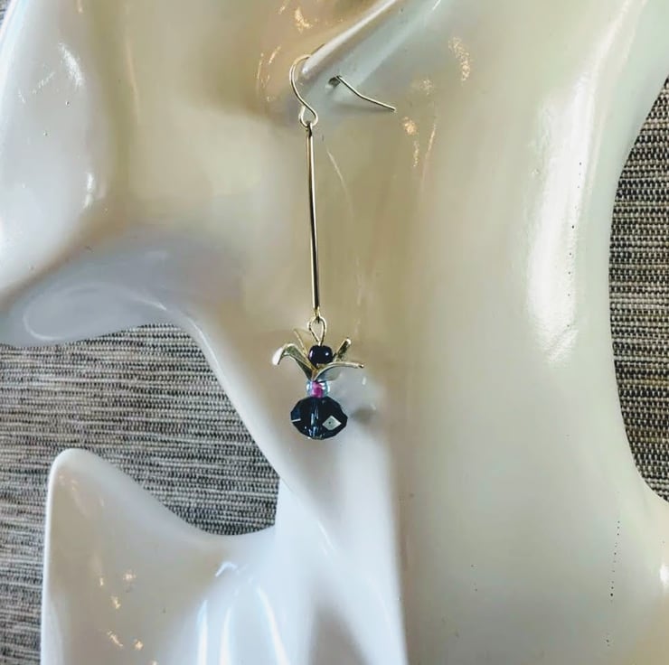 Origami silver colour crane bird on long silver colour bar pin which dangles elegantly from the ear. Featuring a large midnight blue glass faceted bead which reflects beautifully in the light. Two mini rochelles in midnight blue and sky blue with a hint of pink for that added pop of colour. Light weight on silver plated ear wires.