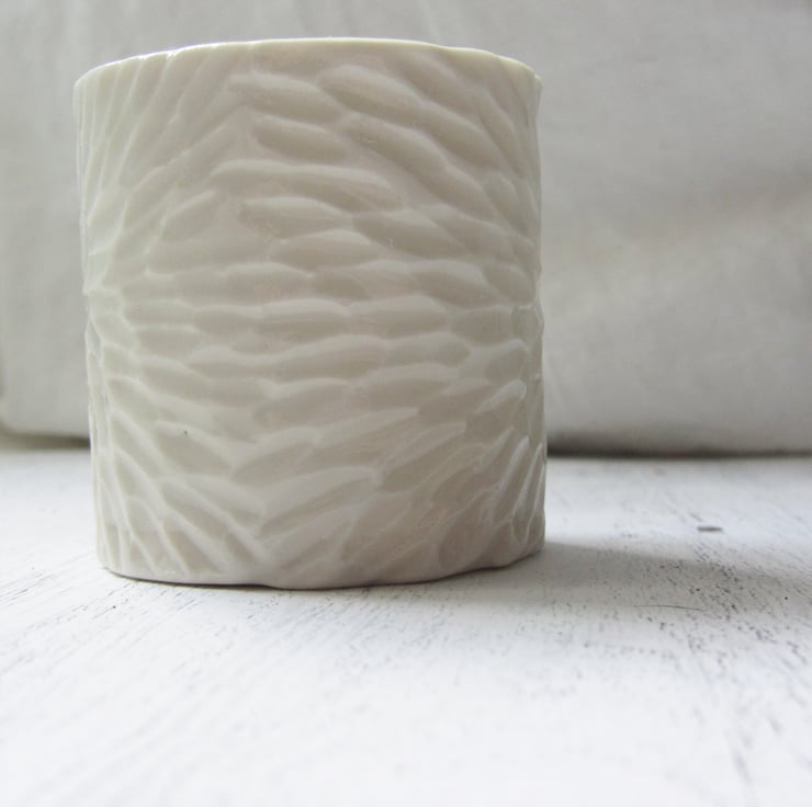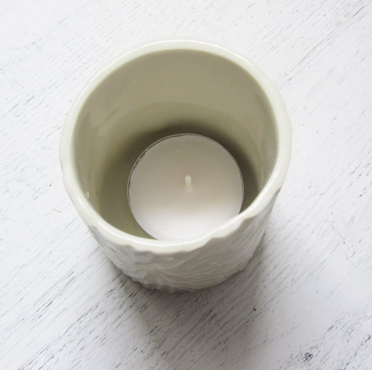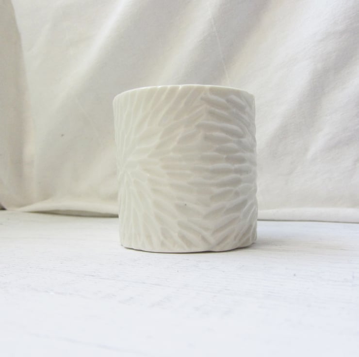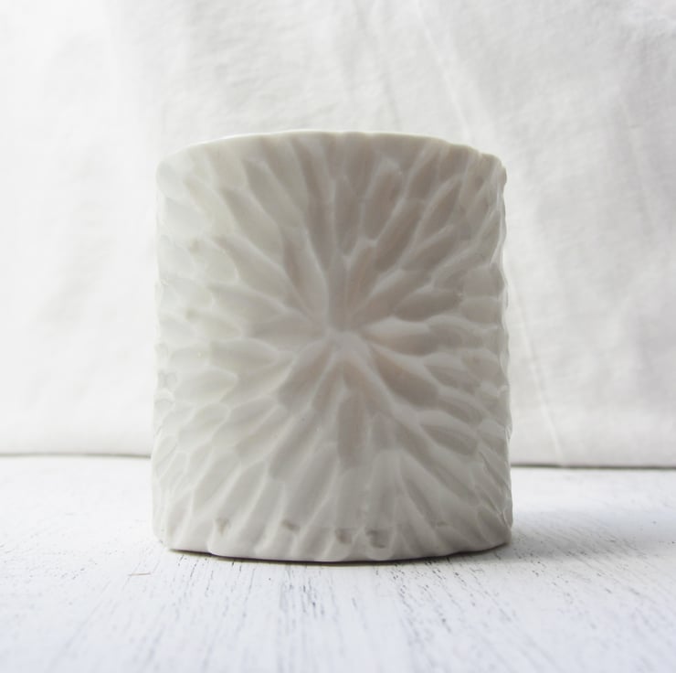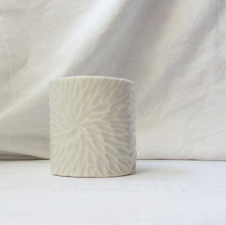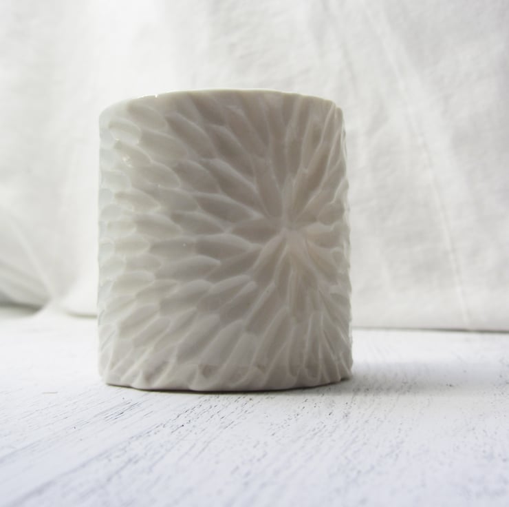 Porcelain tealight holder that has been carved with a pattern inspired by the centre of a dahlia.