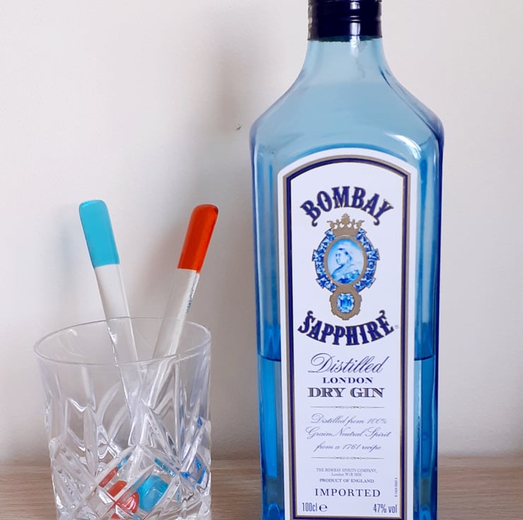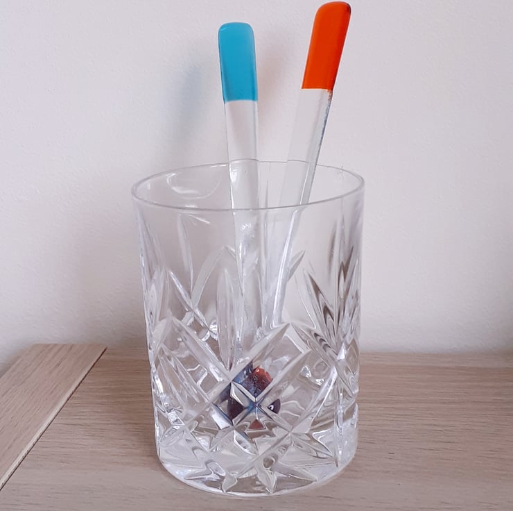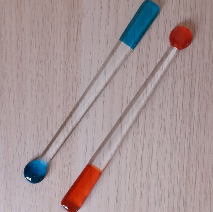 Set of two handmade fused glass drink stirrers in bright jewel-like colours. Each stirrer is approx 17cm long.
