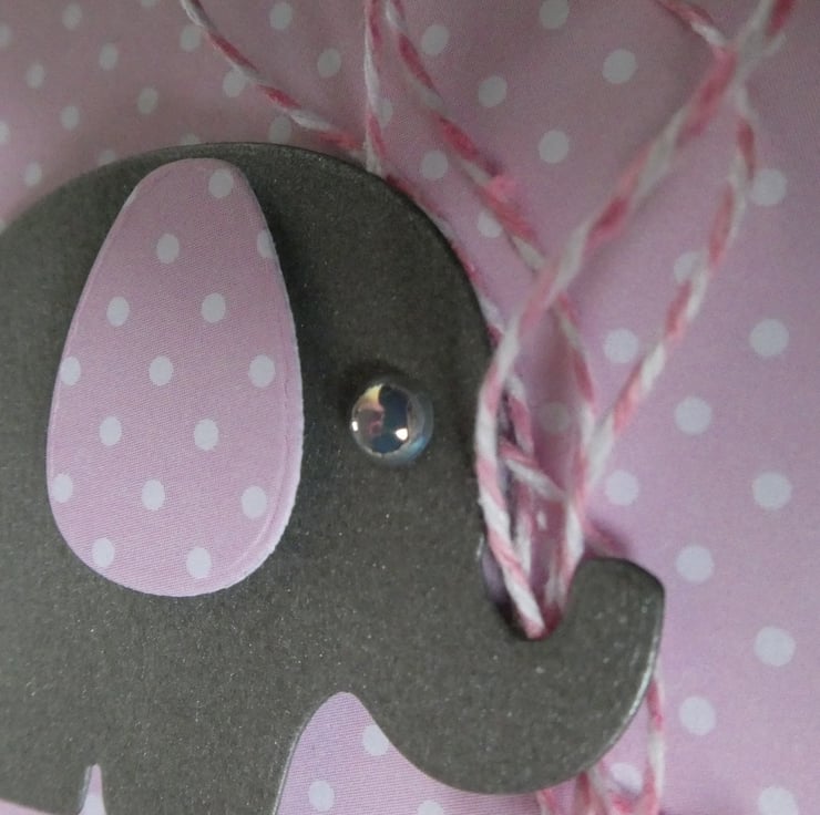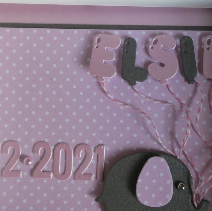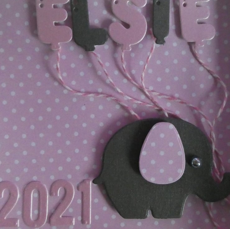 The design is framed with pink and grey pearlescent card which is also used for the date of birth and the balloons which the elephant holds spelling out the baby's name. Pink and white bakers twine is used to give the impression of the elephant holding the balloons and the design is finished with faux pearls.