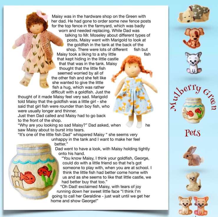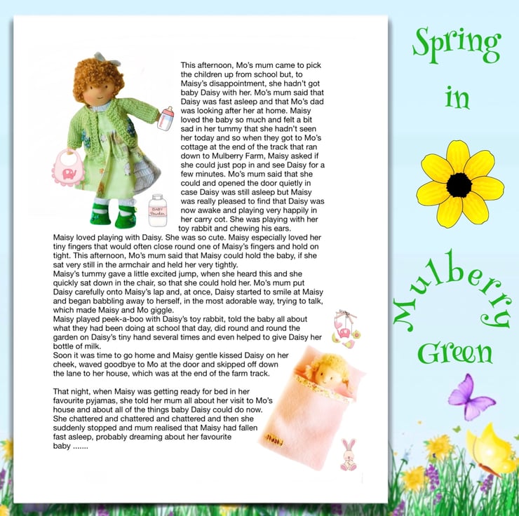 There are other children in Maisy’s class at school - Violet, Billy with his pet rabbit, Amber, Tilly, Rosie and her kittens, Amelia, Ruby, Marigold, Bobby with Max the dog, and the twins Oliver and Olivia, who have a puppy called Oscar. The dolls are all 28cm tall and baby Daisy is 16cm. Maisy and Mo love nothing more than having adventures with their friends. You can read about their adventures on my Facebook and Instagram pages - Maisy Muffin Rag Dolls and on my Mulberry Green Pinterest boards.