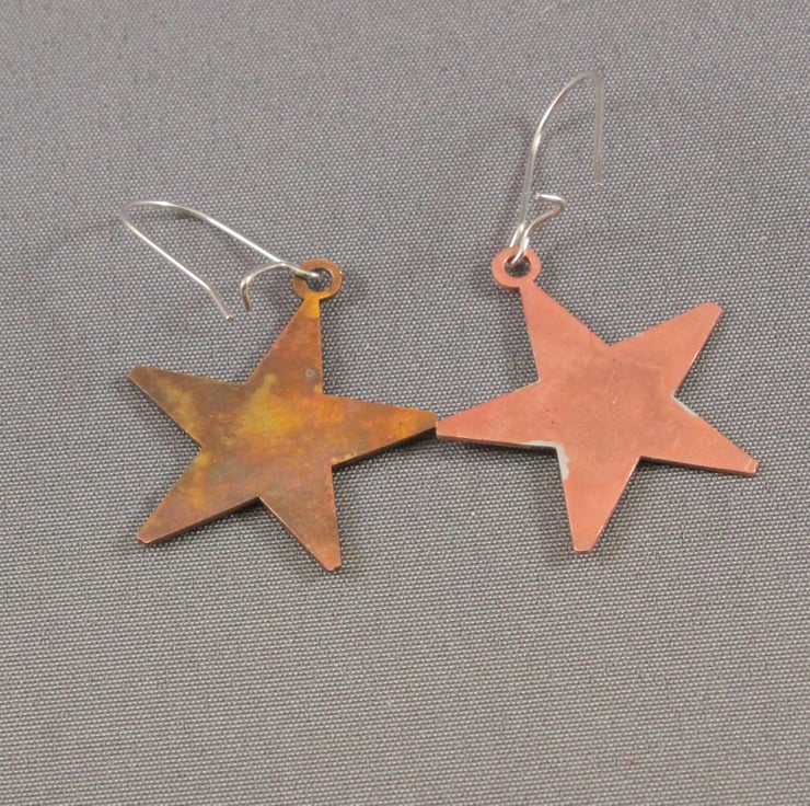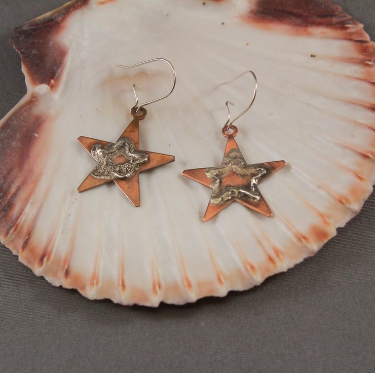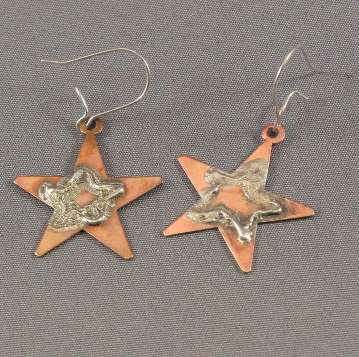 These little stars are made by heating silver wire on the brass star shapes until it melts slightly and fuses to the surface. Because I'm not using solder and flux the copper in the brass seems to come to the surface so they look like copper, they are actually brass. They don't react to reheating the same way that actual copper does so you tend not to get as many colours appearing.