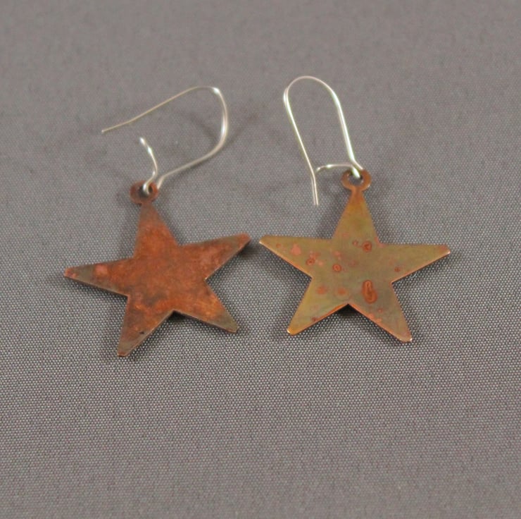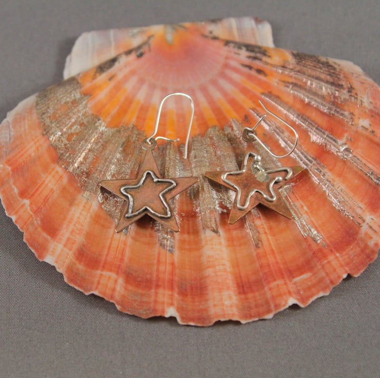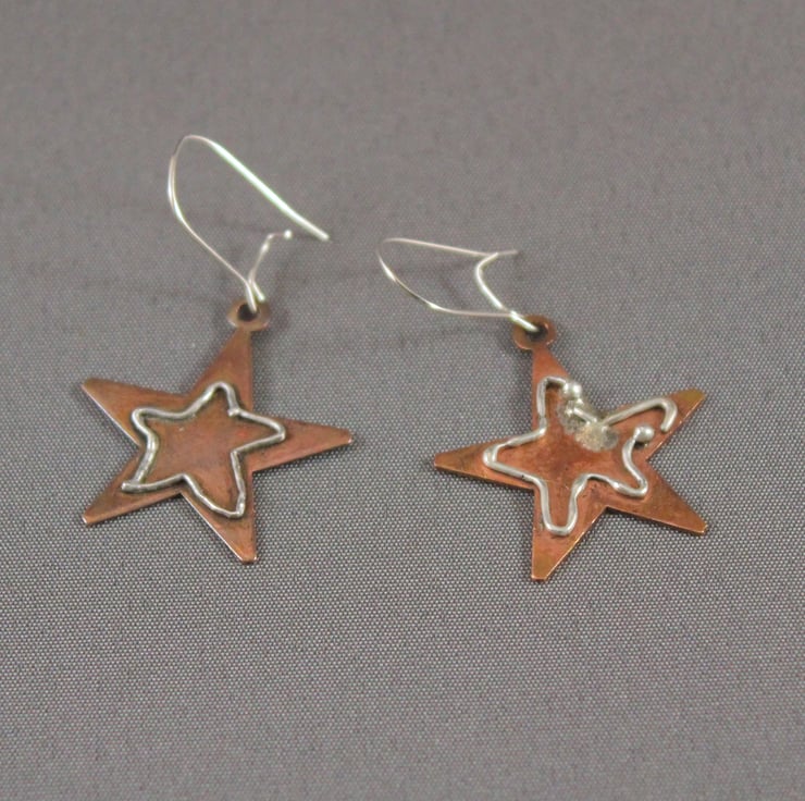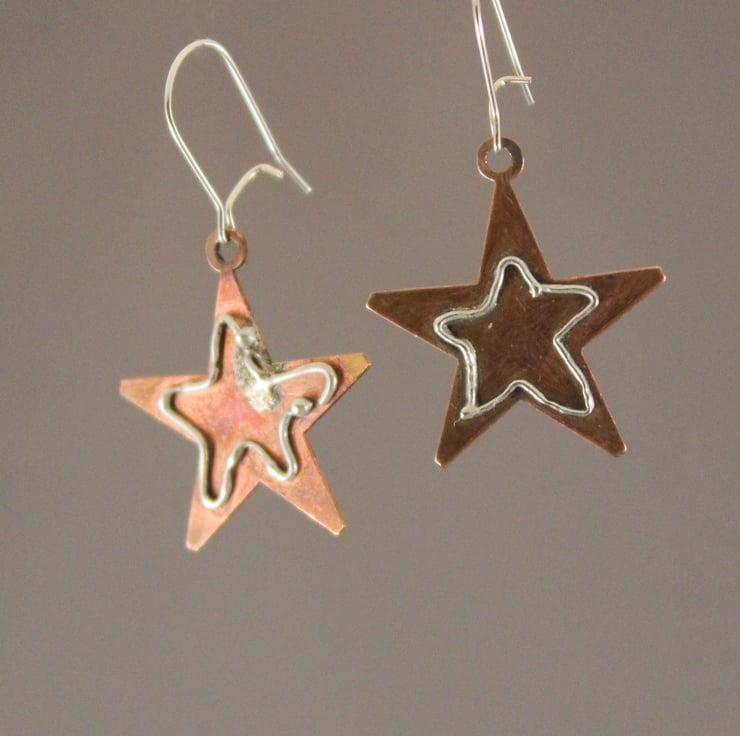 Small copper stars with a star of silver wire fused inside the shape, the wire follows the star shape more or less but I like them to be a bit quirky so it's somewhat approximate. I tried several times to get a matching pair, this is the closest I came to that, hopefully someone will love them for their uniqueness.