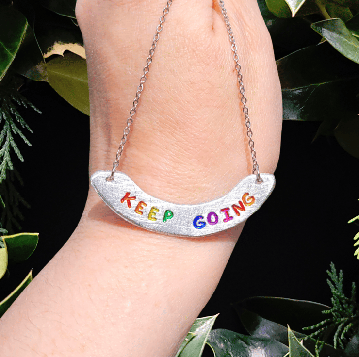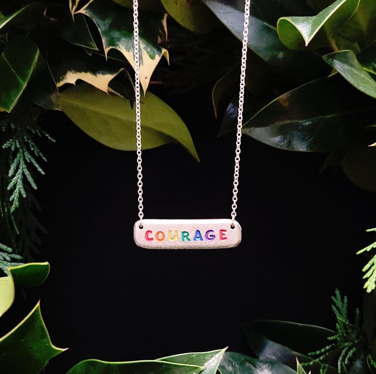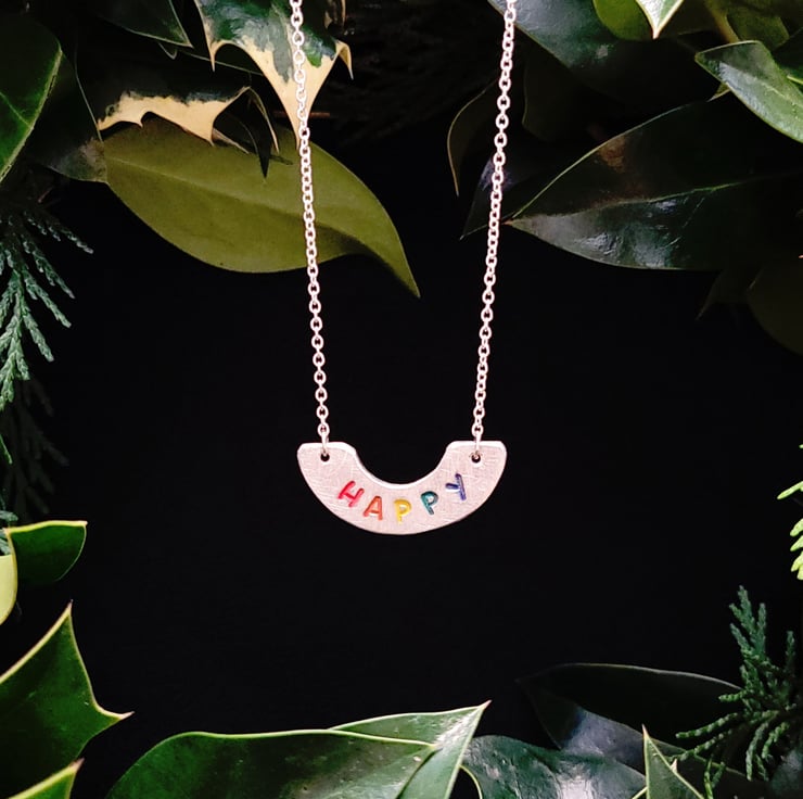 Small pewter offcuts are shaped, sanded and stamped with an encouraging word or a phrase of positivity, handpainted with acrylic paint in my signature rainbow, then sealed in the oven with Efcolor cold enamel resin powder.