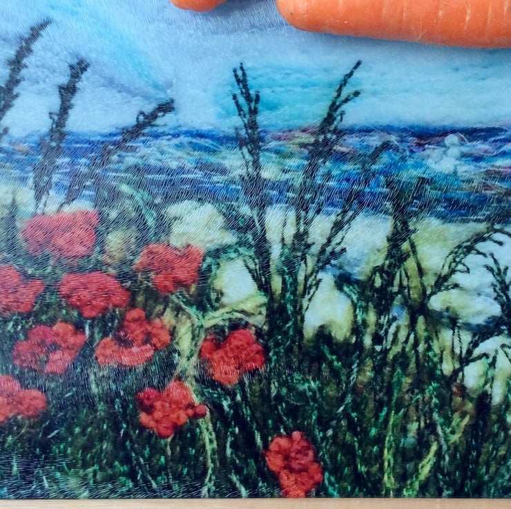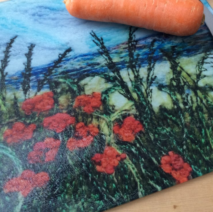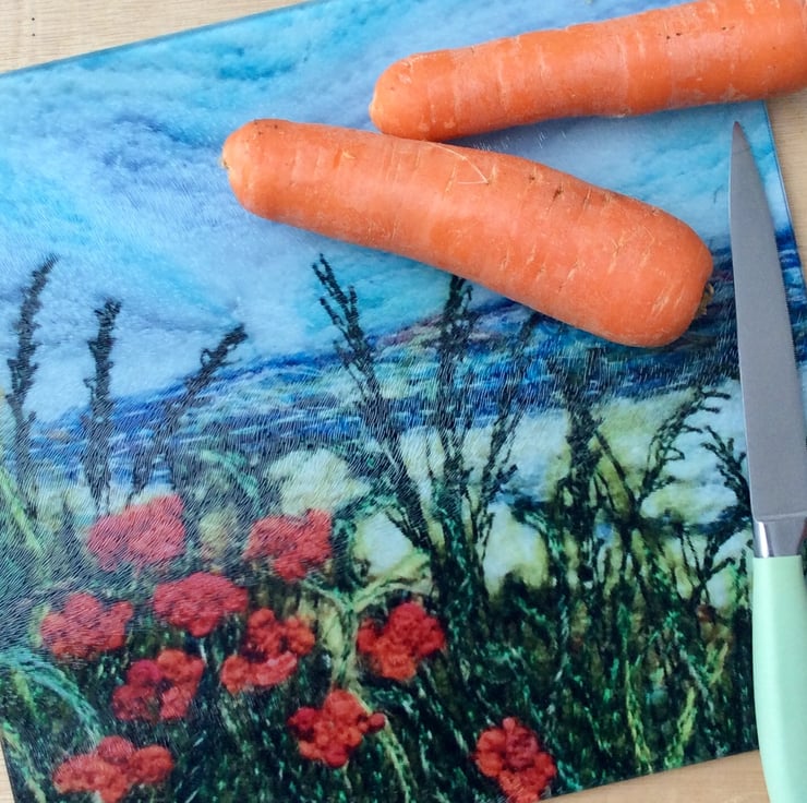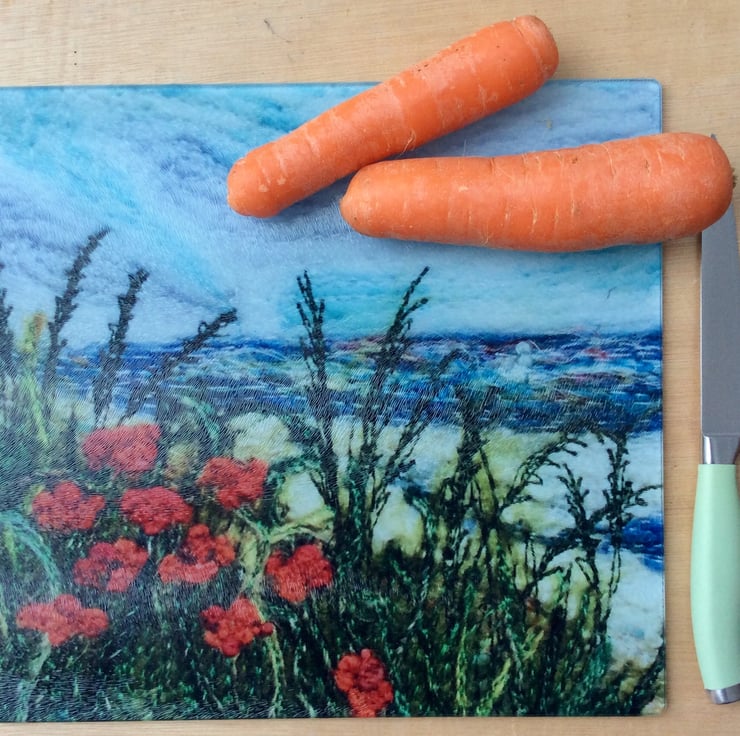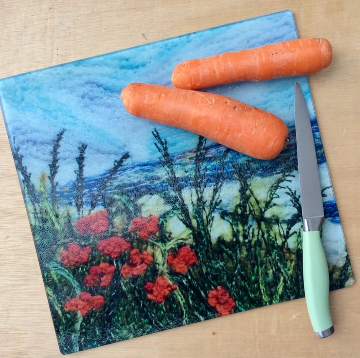 This unique glass textured chopping board has my textile seascape of Saltburn-by-the sea through poppies. The glass board is heat resistant, makes a perfect cheeseboard, work top saver and a stunning center piece for the table. Easily cleaned. Size 28 x 30cm approx.