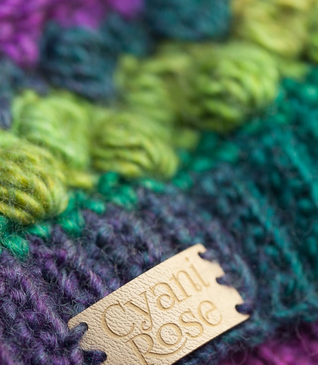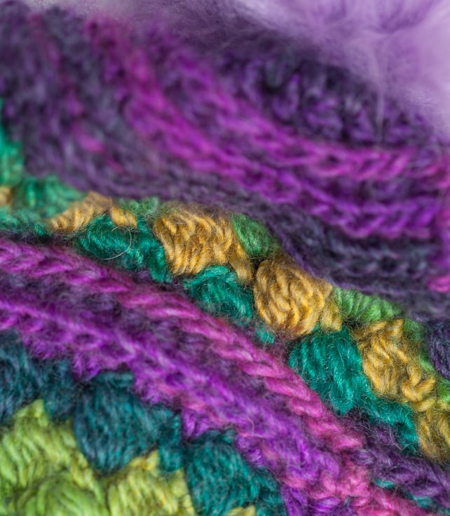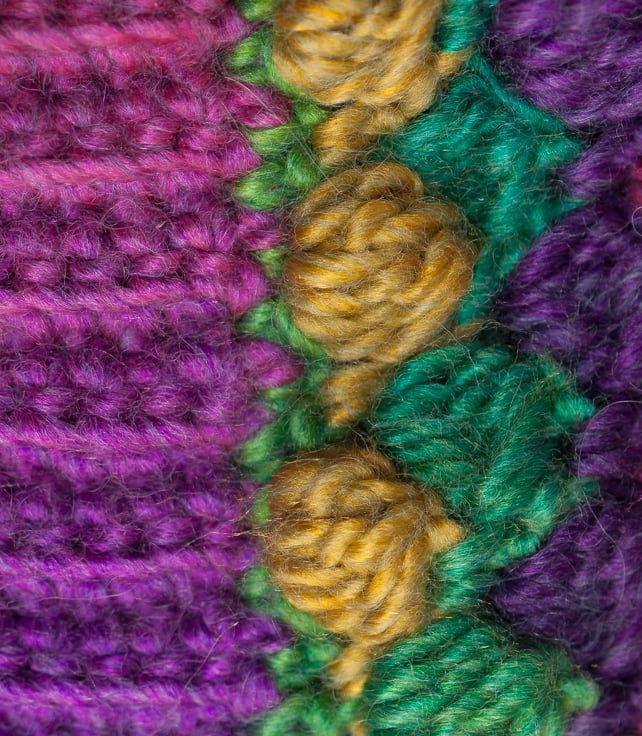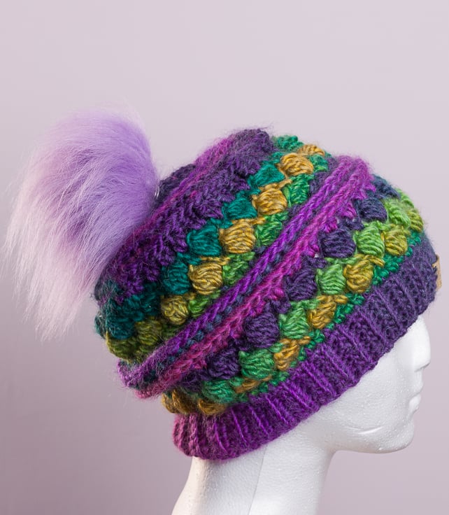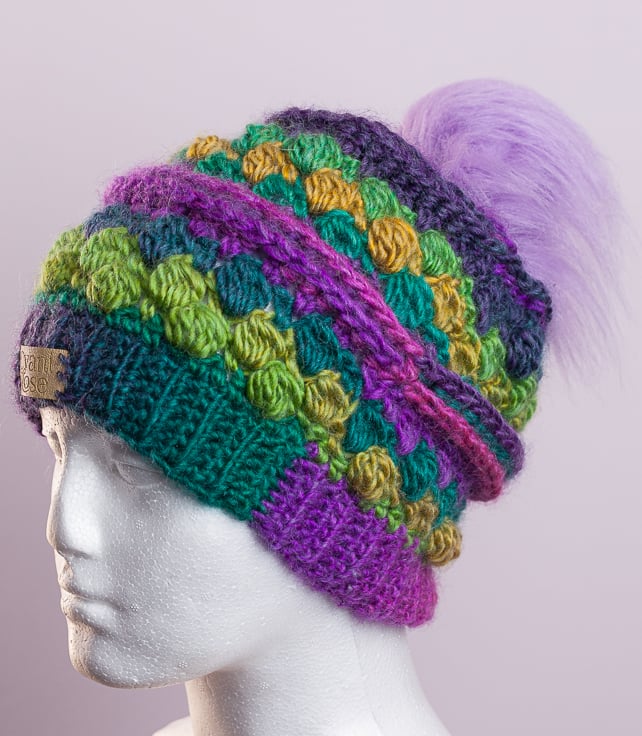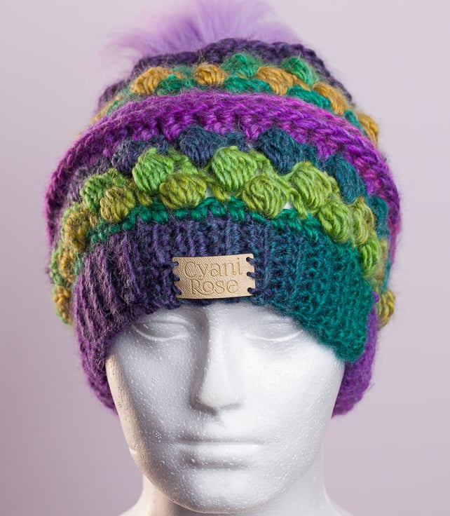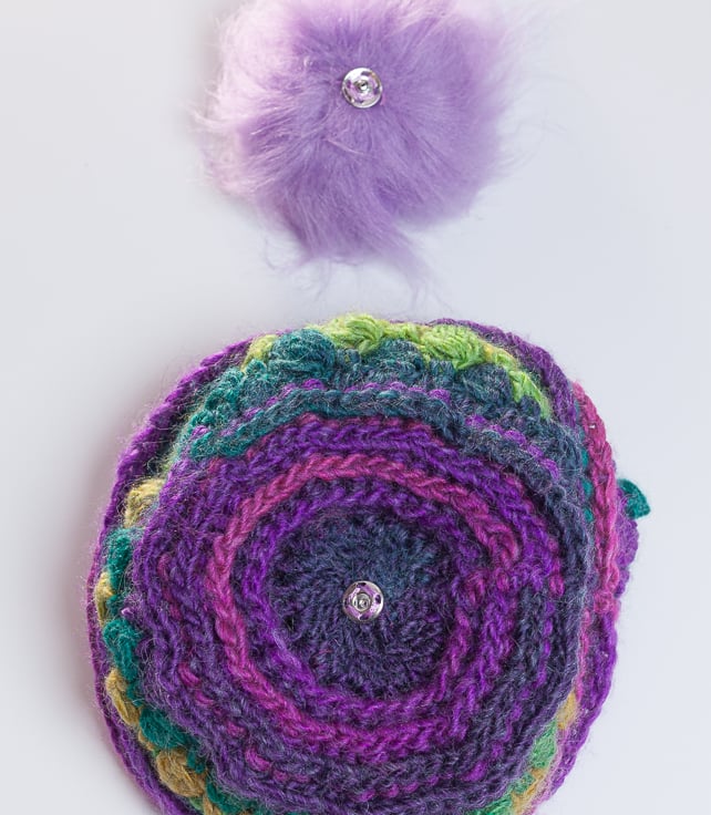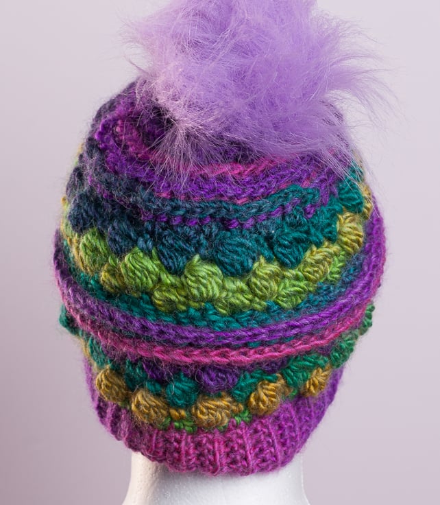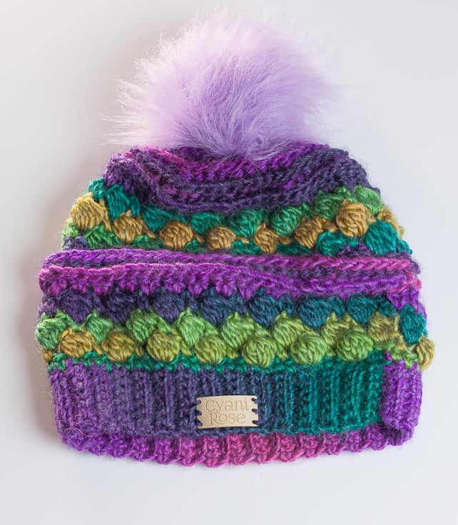 It is a lovely bright colour with a fluffy lilac pompom. I have also hand made the pompom from faux fur material. I decided to make my own after reading reports that some faux fur pompoms sold on the high street were shown to contain animal fur. By making them myself I can see the back of the fabric structure and see it is not an animal product. It is stuffed with acrylic toy stuffing.