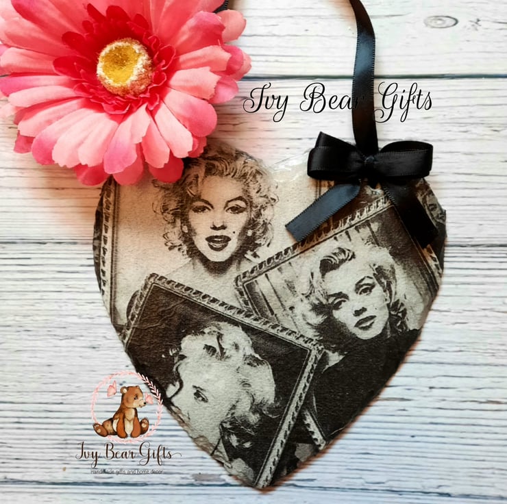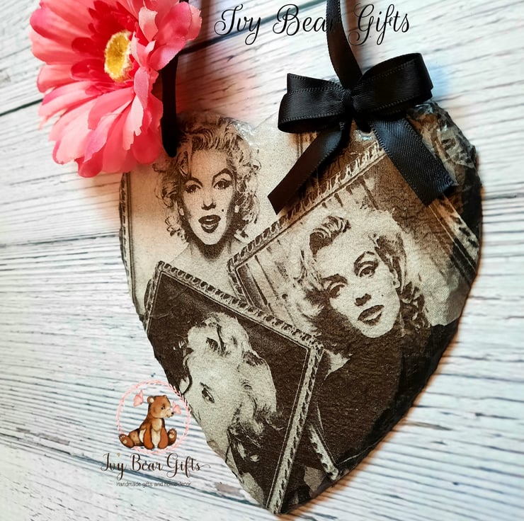 The design is monochrome black and white and has been handpainted, decoupaged and varnished into a 15x15cm slate heart.