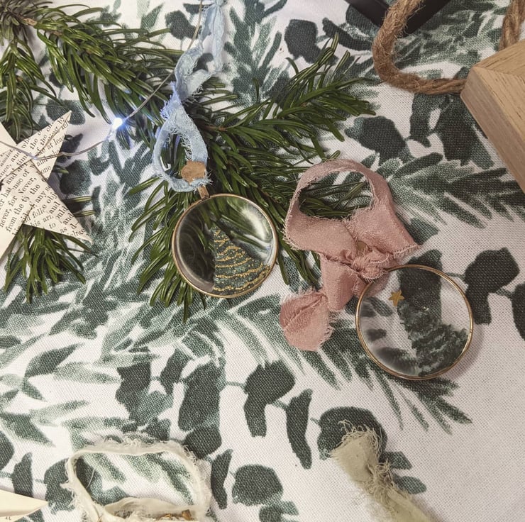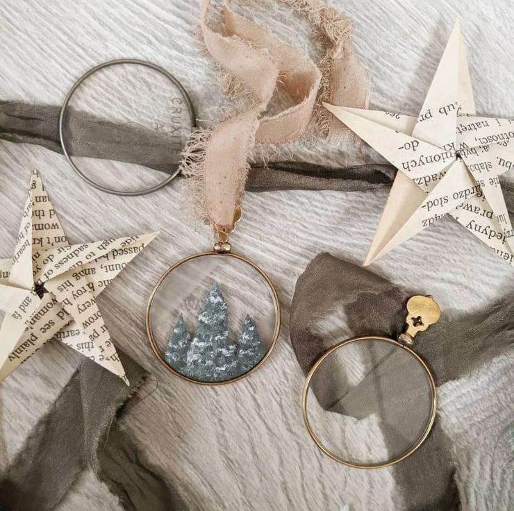 These decorations are made from real vintage optical lenses that have been hand painted with a snowy Christmas tree design and hung on a naturally dyed ribbon.