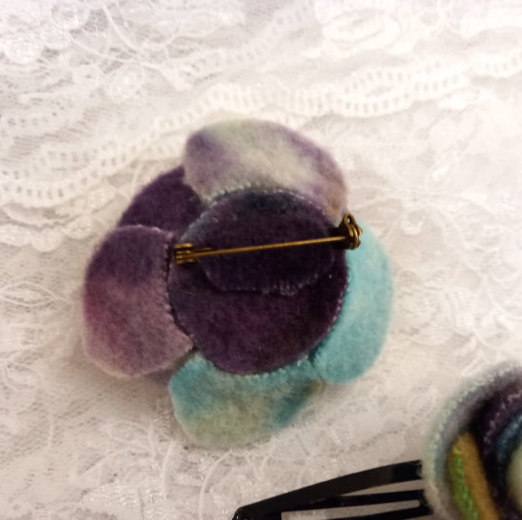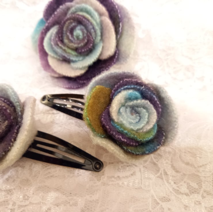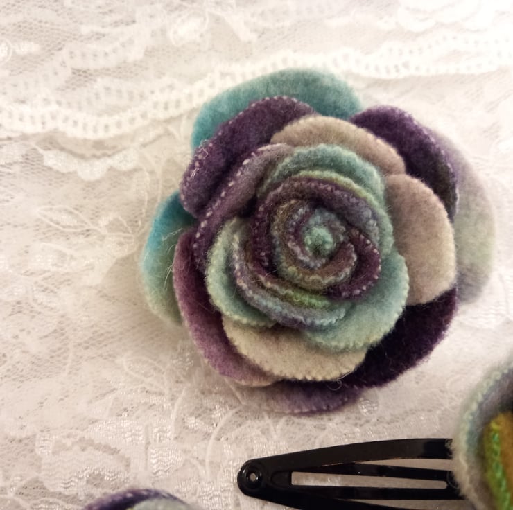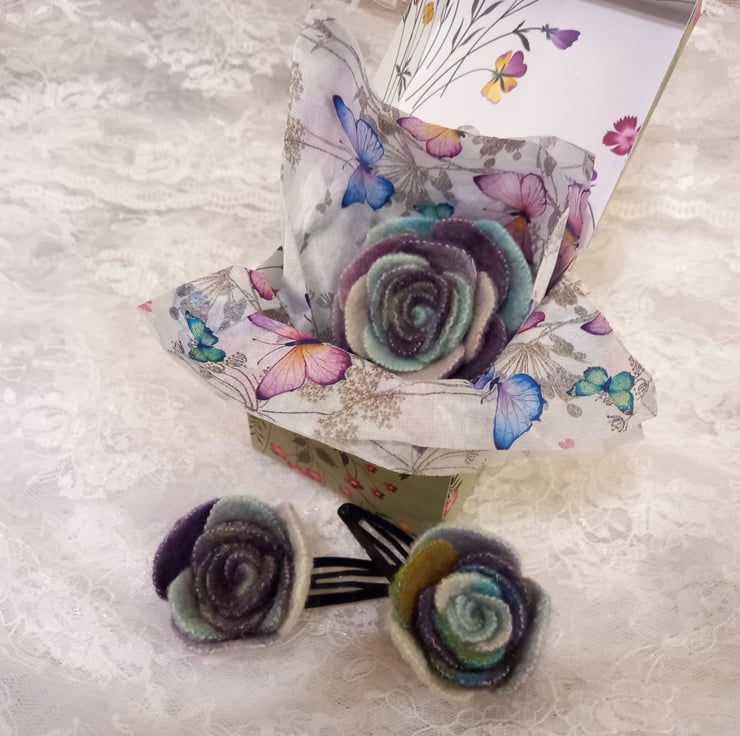 A match set of an upcycled flower brooch and matching hair clips, in a presentation box. Made from offcuts of a vintage 100% wool blanket that had been felted and hand dyed for another project. Waste not want not - these roses were made from offcuts, transformed in to something beautiful. The colours in this are wonderful, with shades of green, purple, blue, turquoise and white. Metal brooch pin on the back and metal snap-type hair clips. Floral presentation box in lightweight card, tied with pink ribbon (ribbon colour can be changed on request, just contact me for available options). Each flower is individually cut, dyed and made by hand, meaning each one is unique.