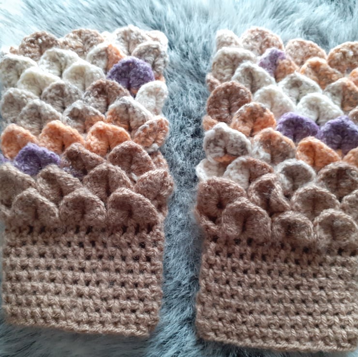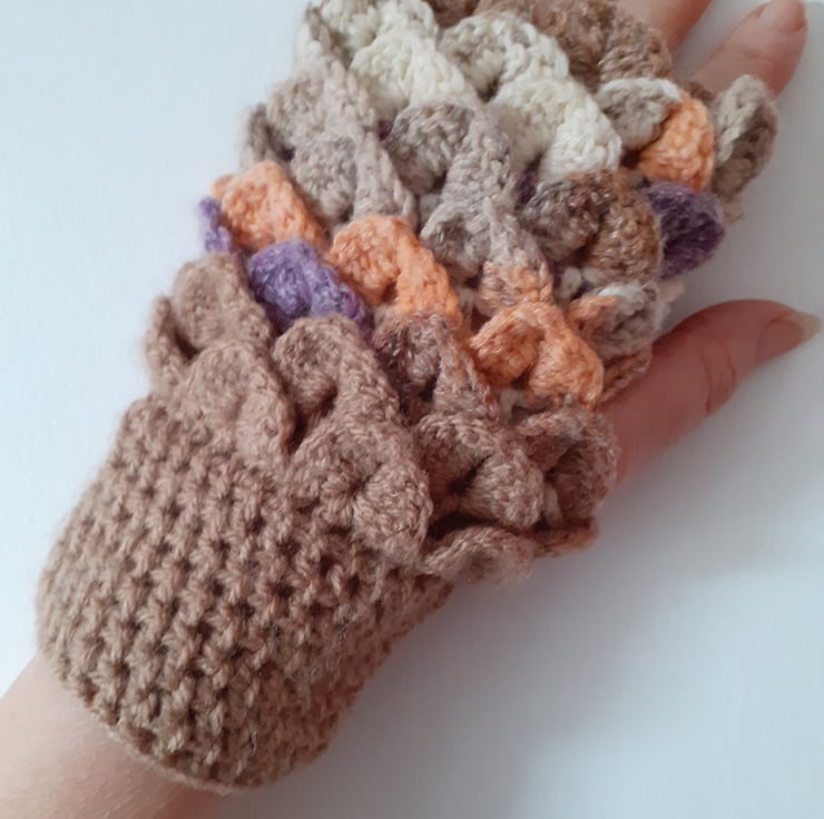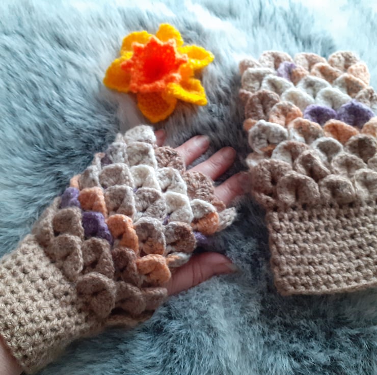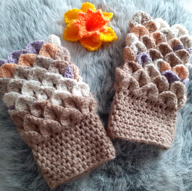 A pair of hand crocheted crocodile/dragon stitch fingerless gloves.