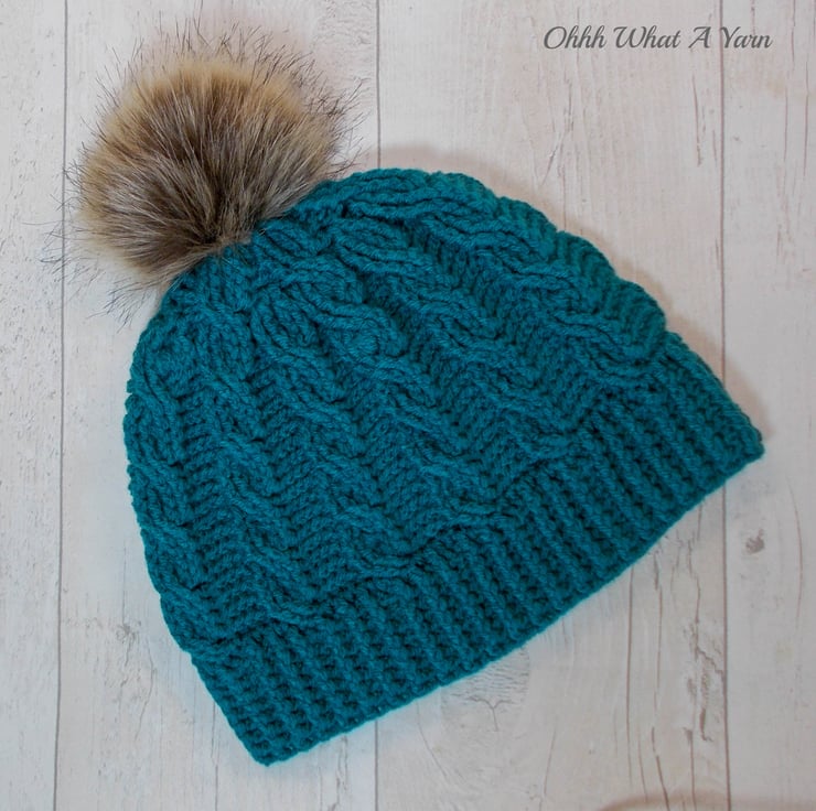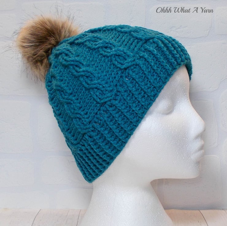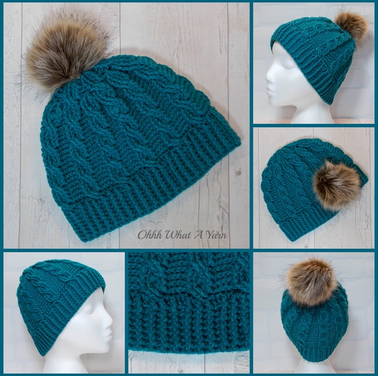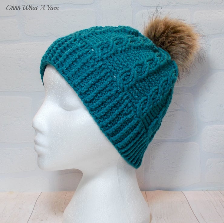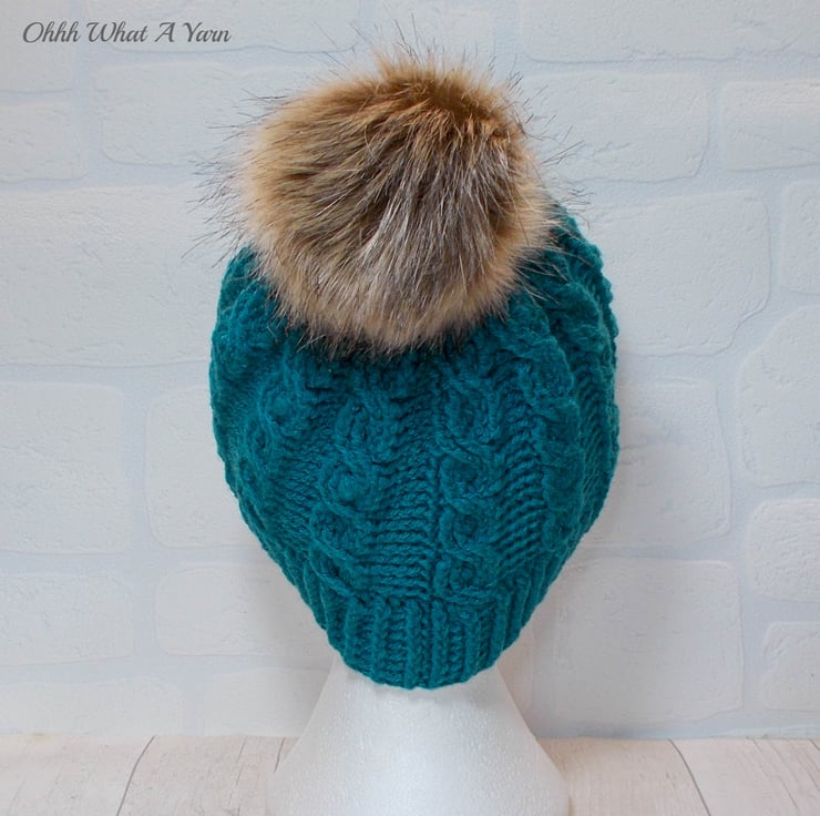 It has a gorgeous cable and bobble pattern and a ribbed edging, and I have added a faux fur pom pom. There is a button on the inside of the hat so you can easily remove the pom pom by unhooking the loop around the button if you prefer your hat fluffless and for washing purposes.