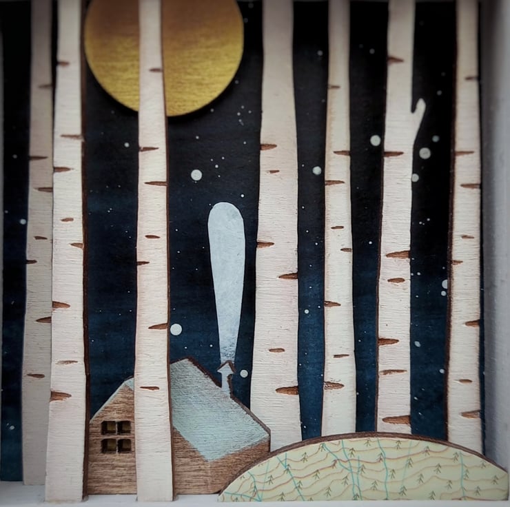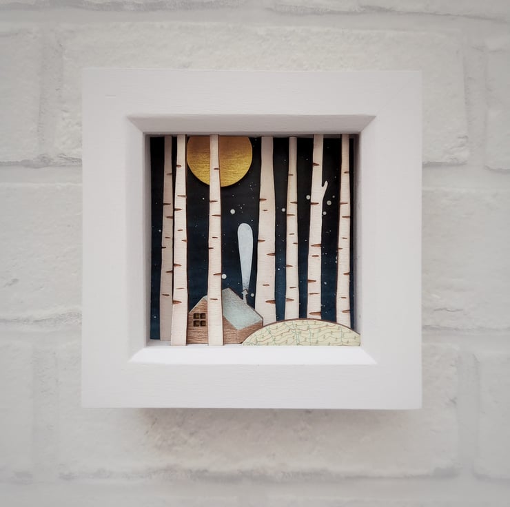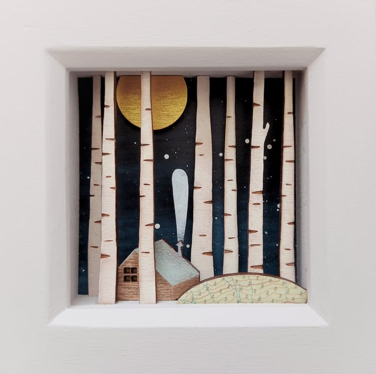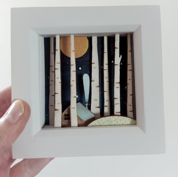 The design comes from original drawings which have been transformed into layers of laser cut wood, which I paint by hand, build up to form 3d layers and set into a glazed, pale grey wooden box frame, which measures approx. 11.5cm; the scene itself measures approx 7.8cm x 7.8cm x 1.5cm.