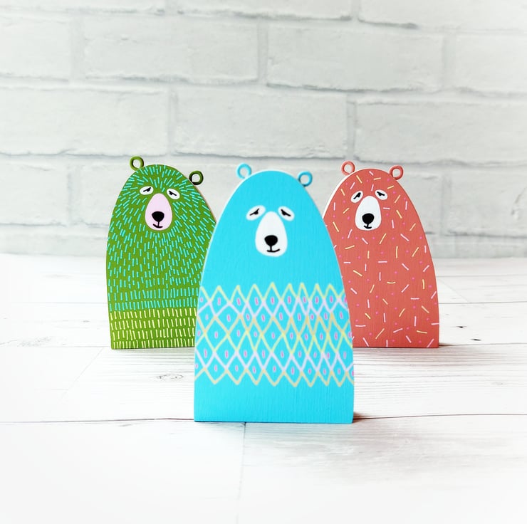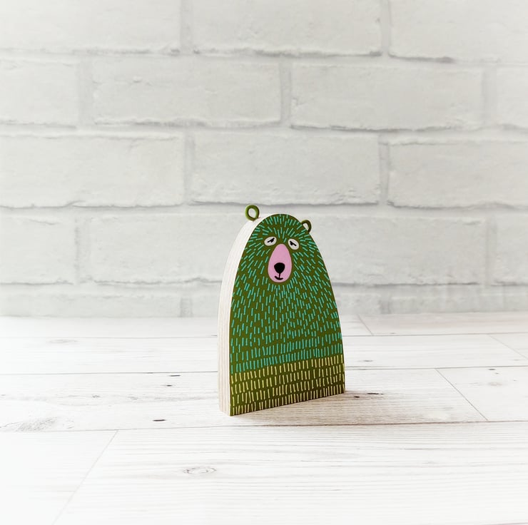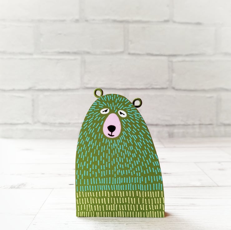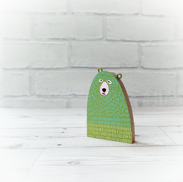 This friendly little wooden bear has been cut from 9mm plywood, painted green and decorated with turquoise and yellow f'ur' on both sides.